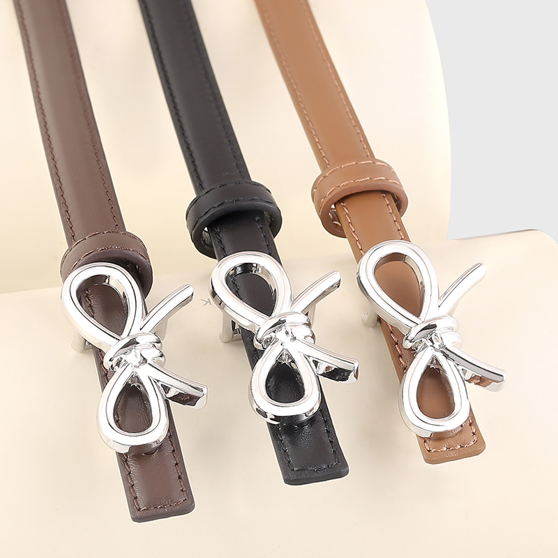 新款真皮皮带女士银色蝴蝶结按扣款百搭牛仔裤收腰腰带女