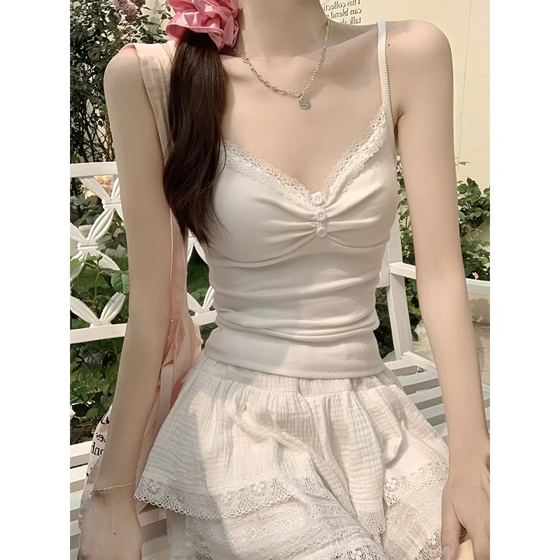 白色纯欲v领性感美背吊带女夏季bm辣妹蕾丝花边收腰无袖背心上衣