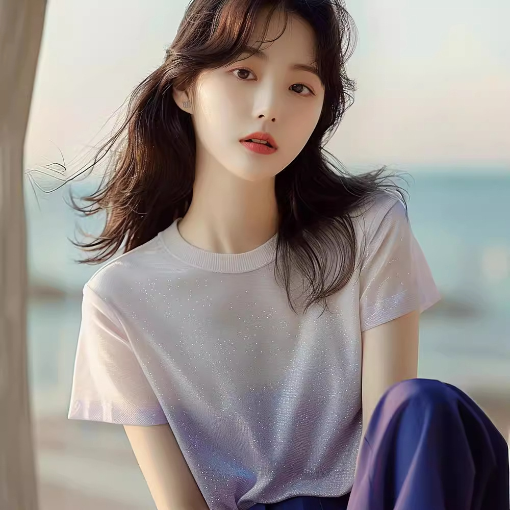 紫色渐变针织短袖t恤女夏季新款今年流行漂亮小衫亮闪闪上衣
