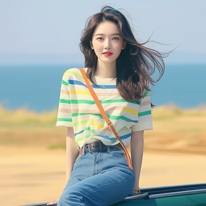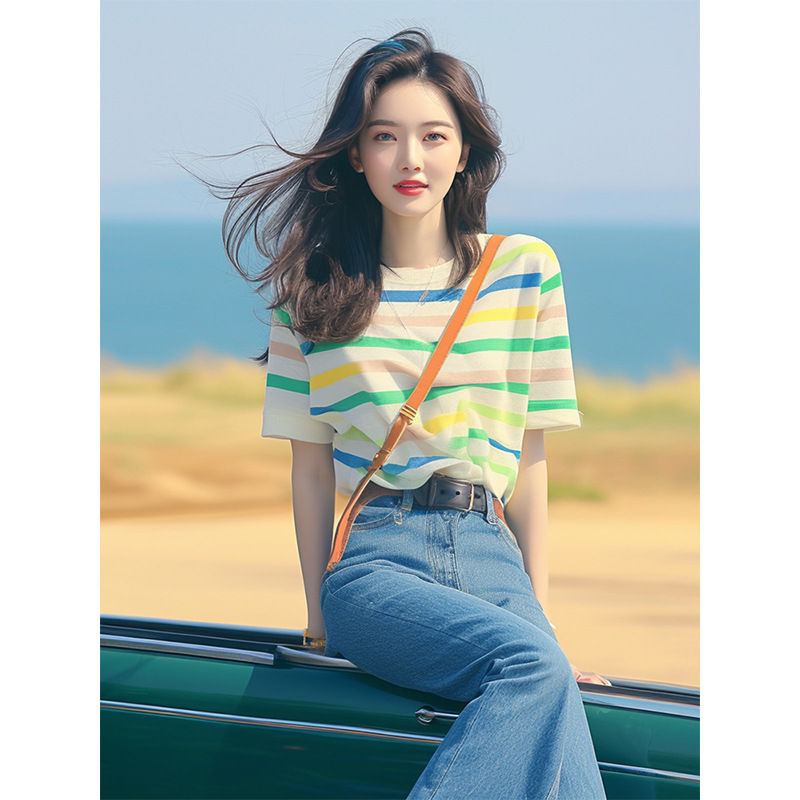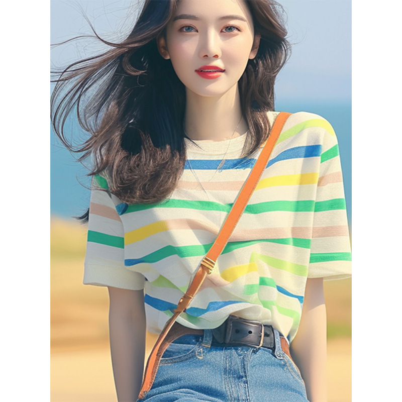洋气独特超好看别致绝美漂亮上衣宽松百搭显瘦条纹短袖T恤女夏季