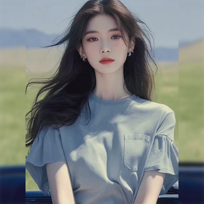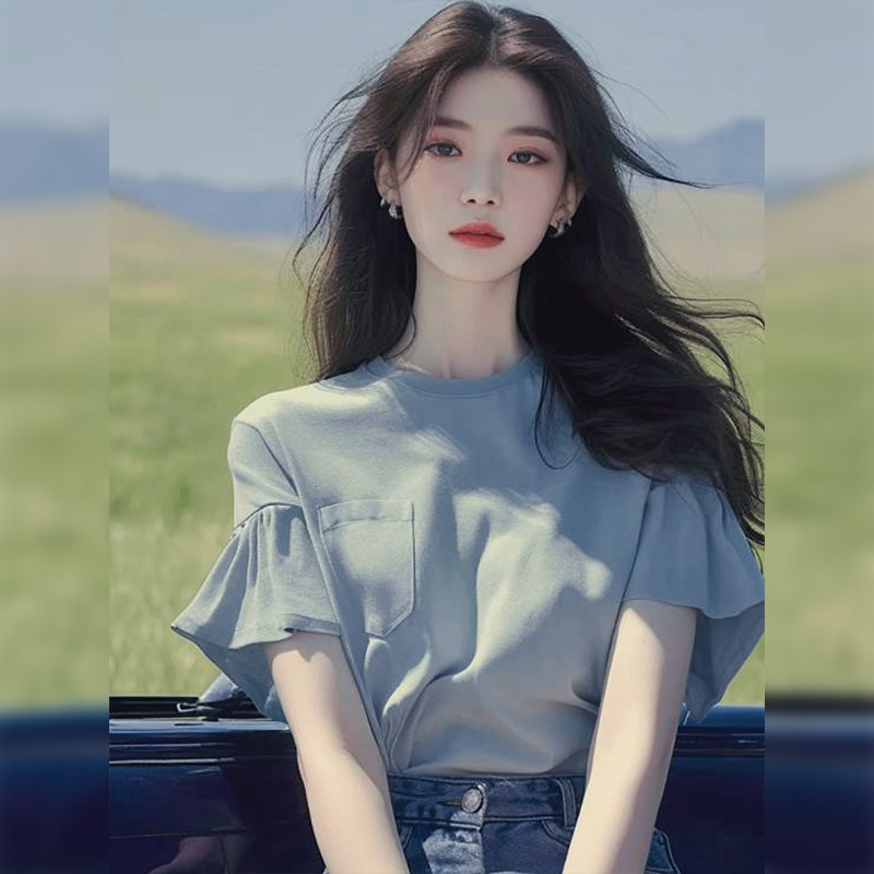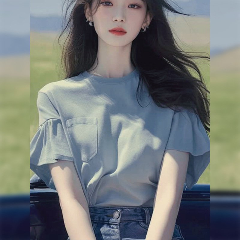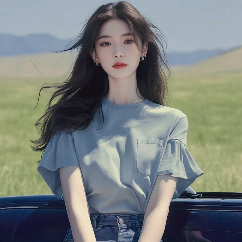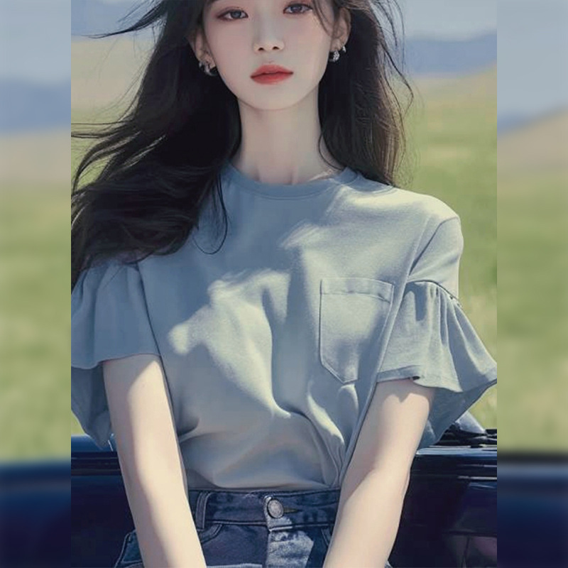 t恤新款小个子小众别致超好看减龄洋气显瘦雾霾蓝荷叶边上衣