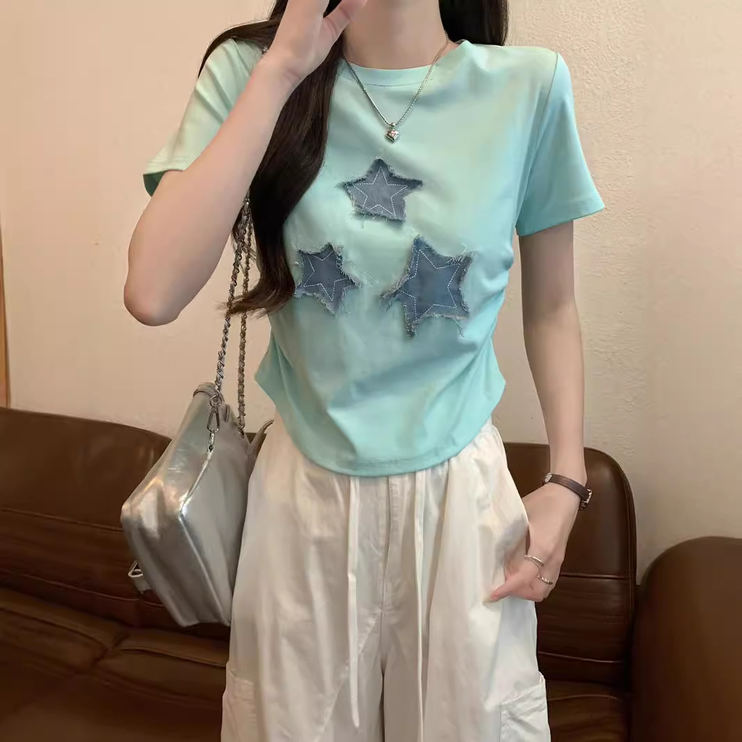 法式蓝色星星正肩小众T恤短袖紧身短款夏日辣妹甜辣上衣女多巴胺