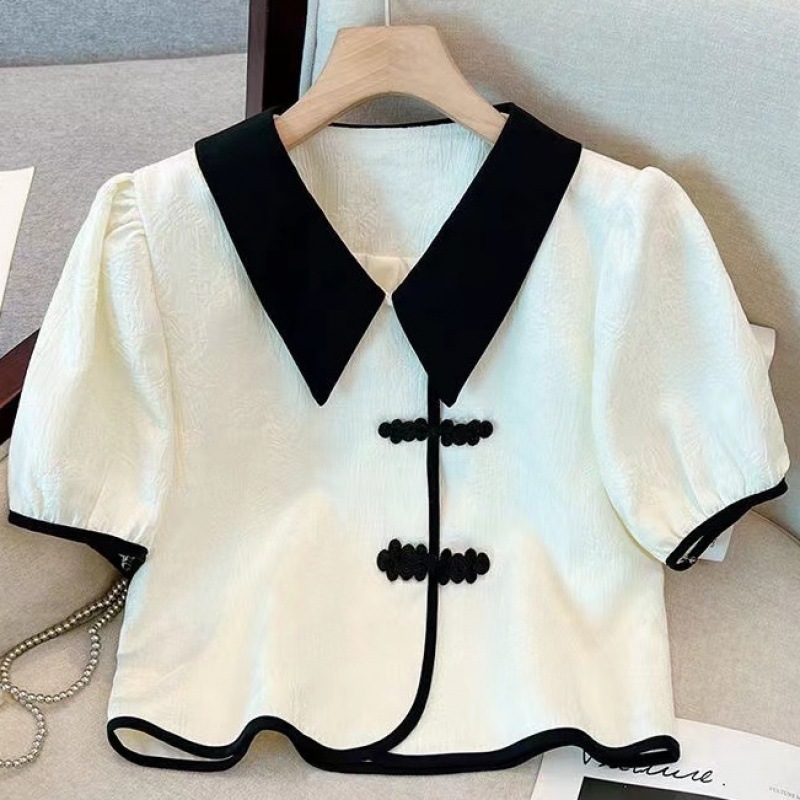 新中式国风盘扣提花短袖衬衫夏季新款高腰设计感小众短款上衣