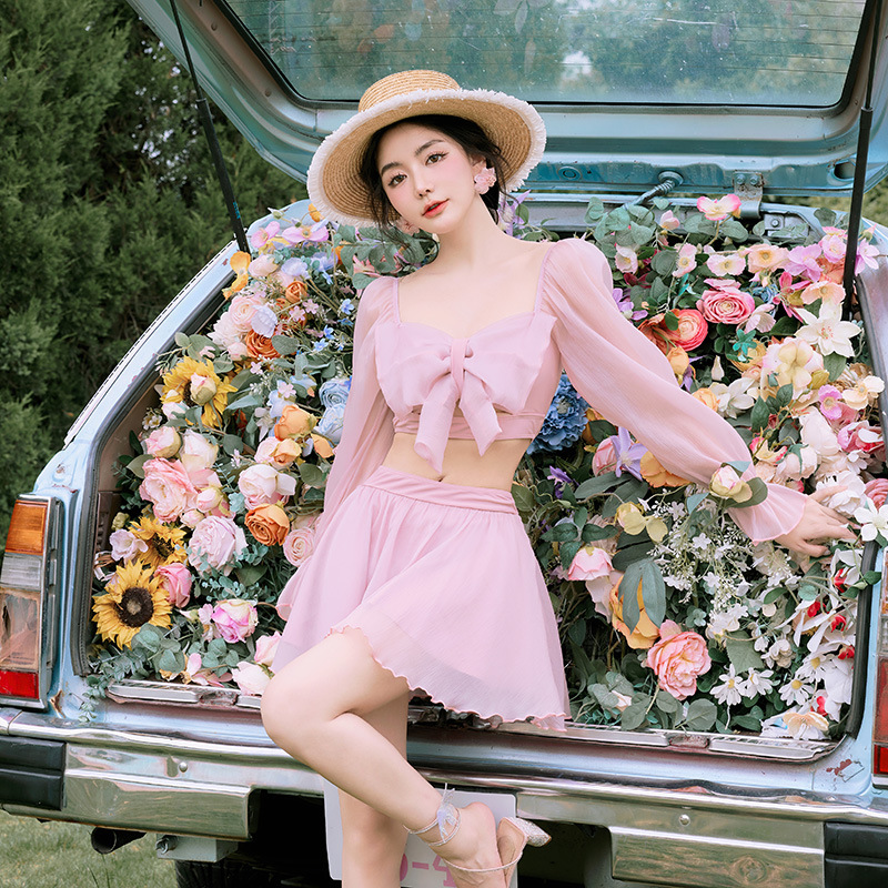 韩版小清新分体泳衣长袖防晒罩衫蝴蝶结款修身遮肉显瘦温泉女泳衣