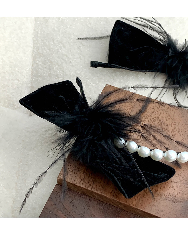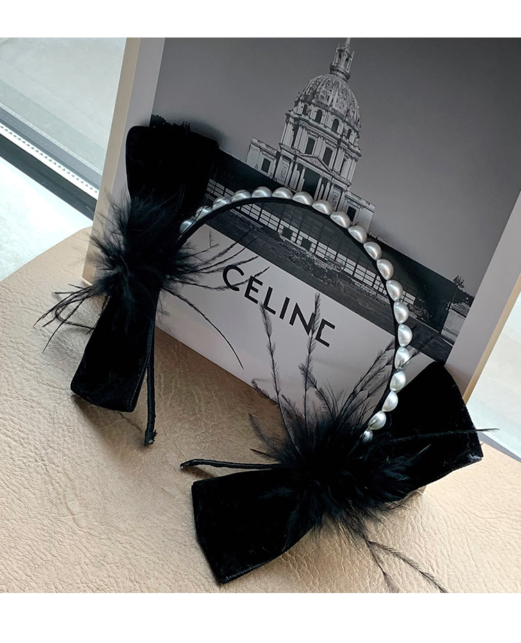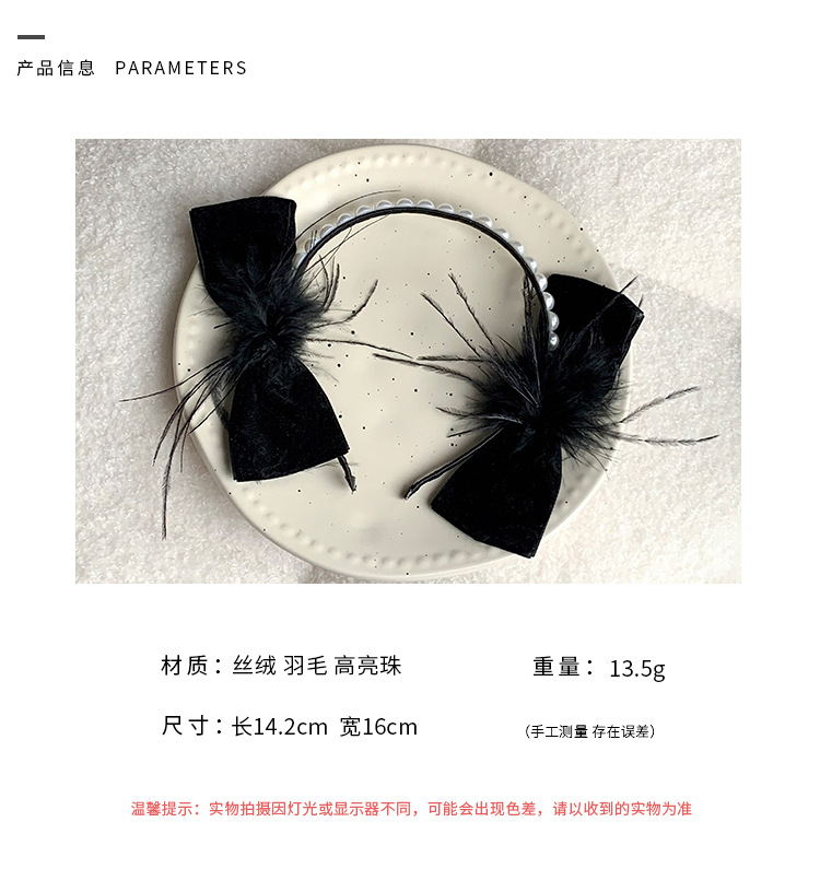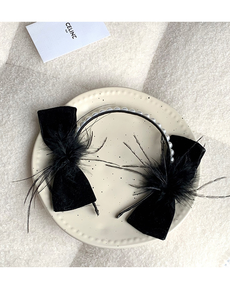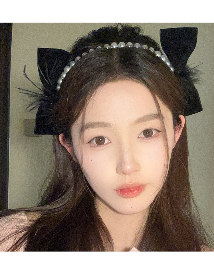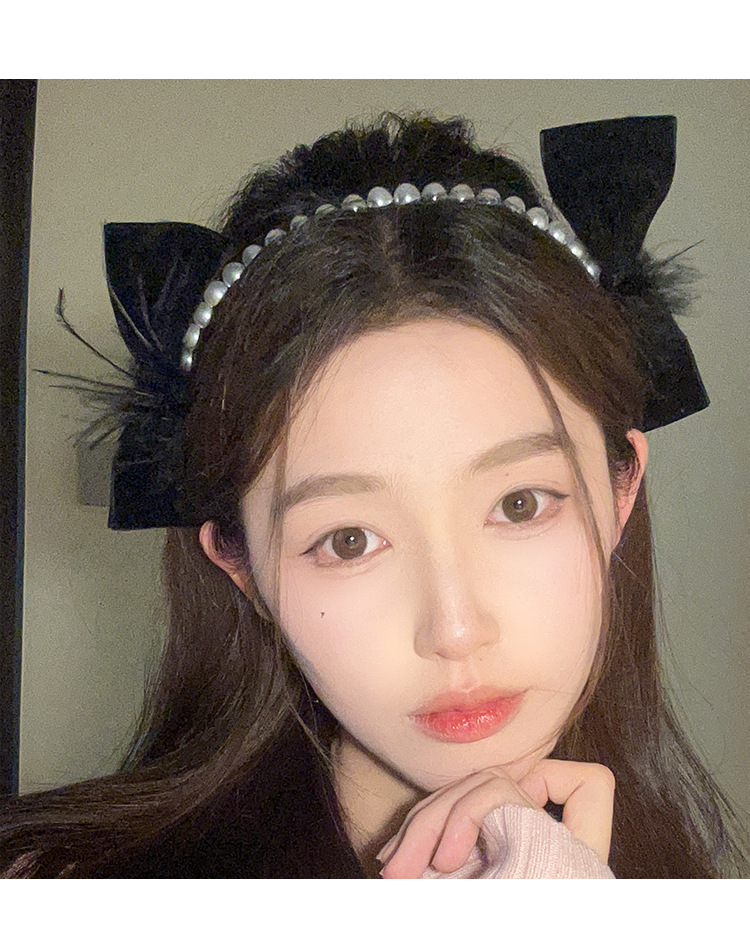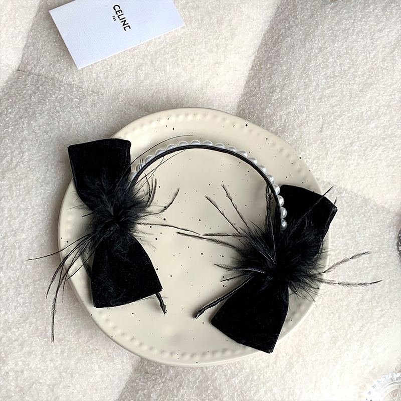 氛围感浪漫气质珍珠蝴蝶结发箍女轻奢高级感黑色羽毛头箍外出头饰