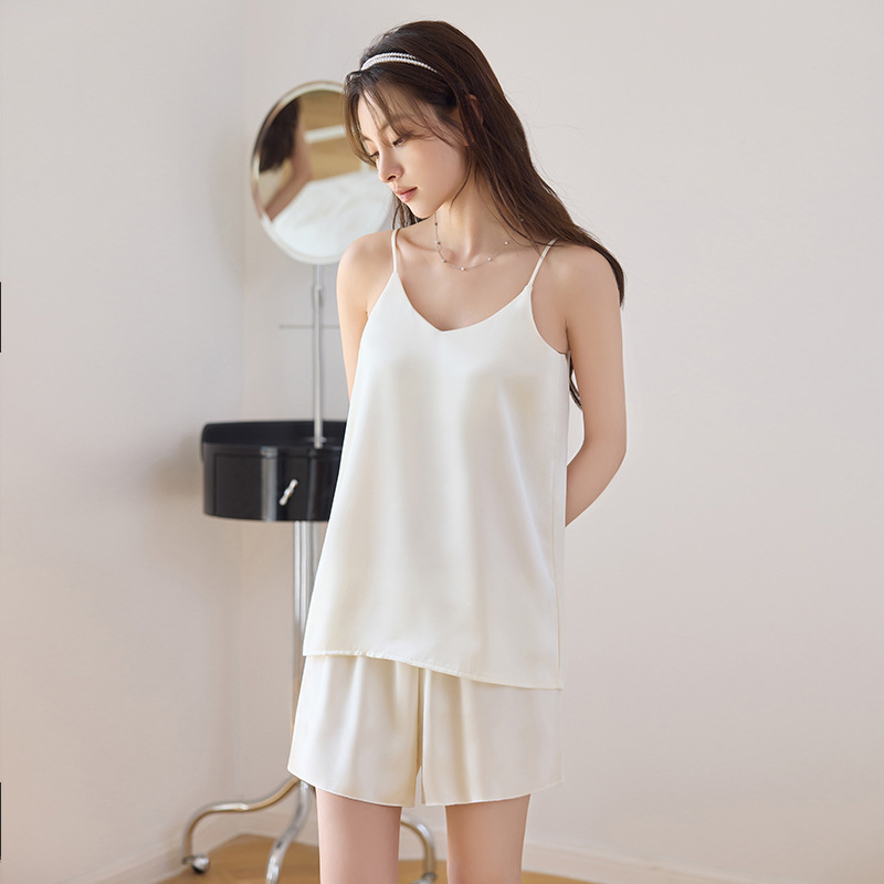 冰丝睡衣套装女宽松夏季薄款吊带背心短裤两件套仿真丝缎面家居服