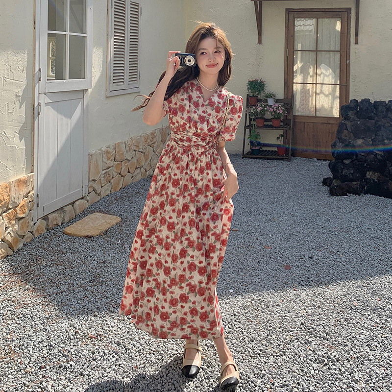 小清新印花连衣裙夏季收腰新款法式显瘦气质休闲裙子碎花长裙