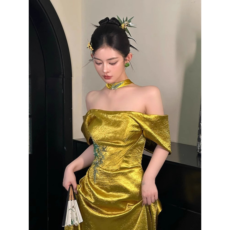 新中式晨袍女新款抹胸新娘订婚礼裙敬酒服一字肩主持人晚礼服