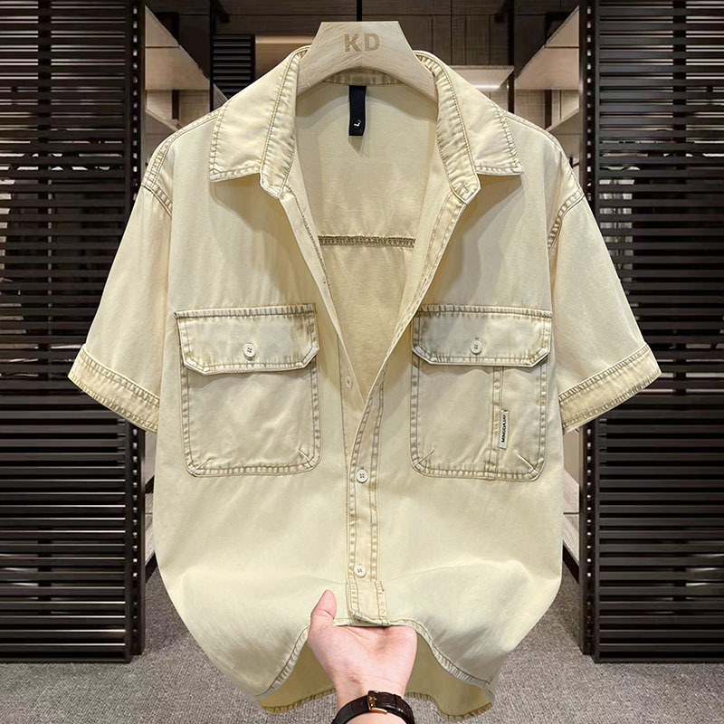 夏季薄款短袖牛仔衬衫男士潮流纯棉水洗工装翻领宽松衬衣休闲