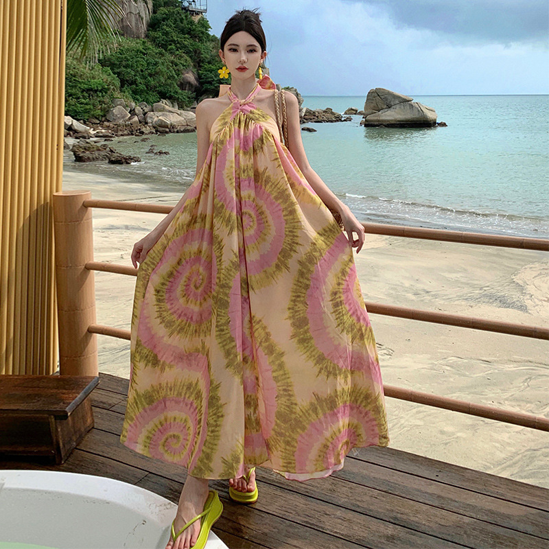 海滩度假风荷叶边拼接个性扎染显瘦露背挂脖吊带小背心夏季