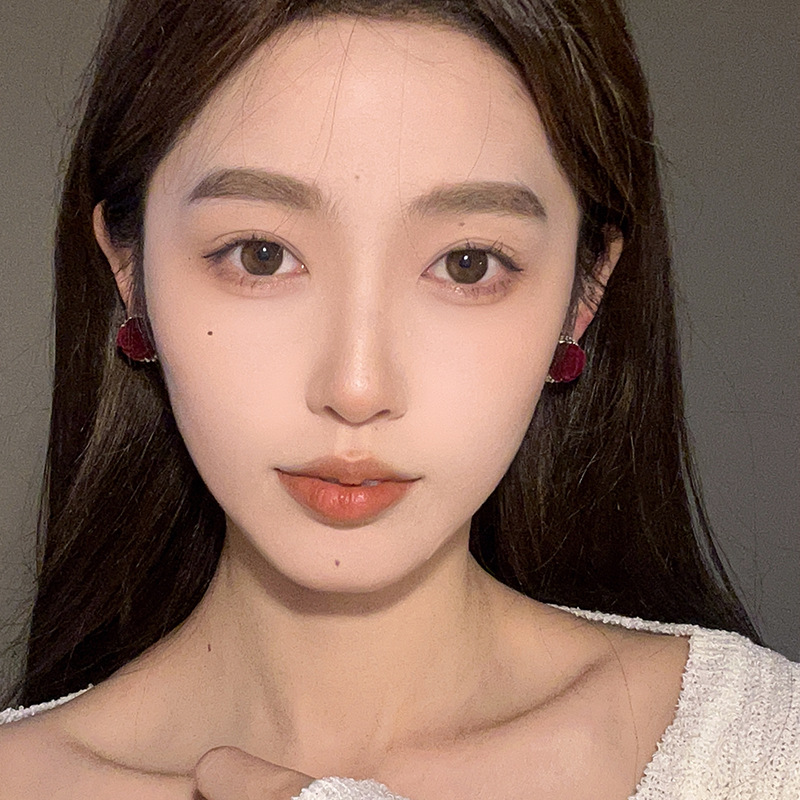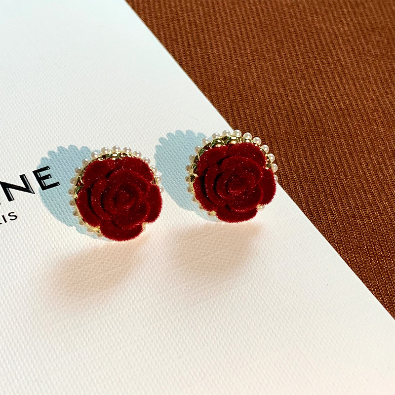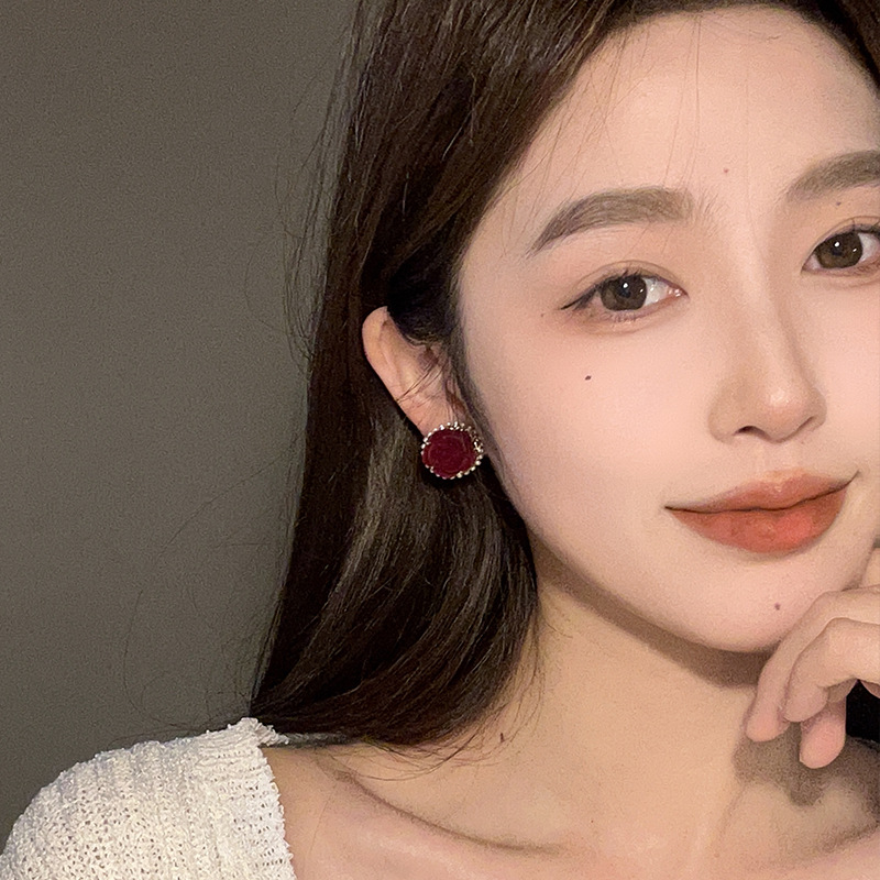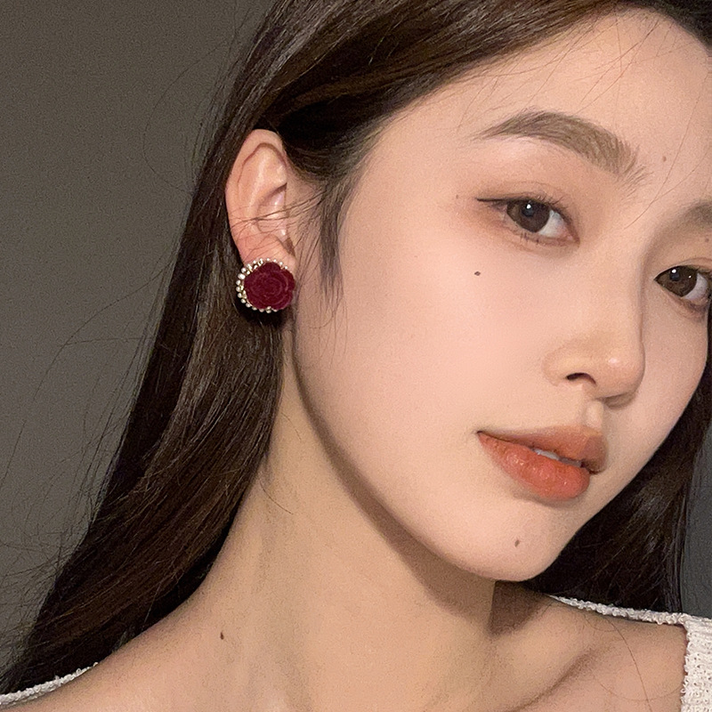 复古酒红色丝绒花朵耳钉气质耳环红色新娘配饰新年高级感耳饰