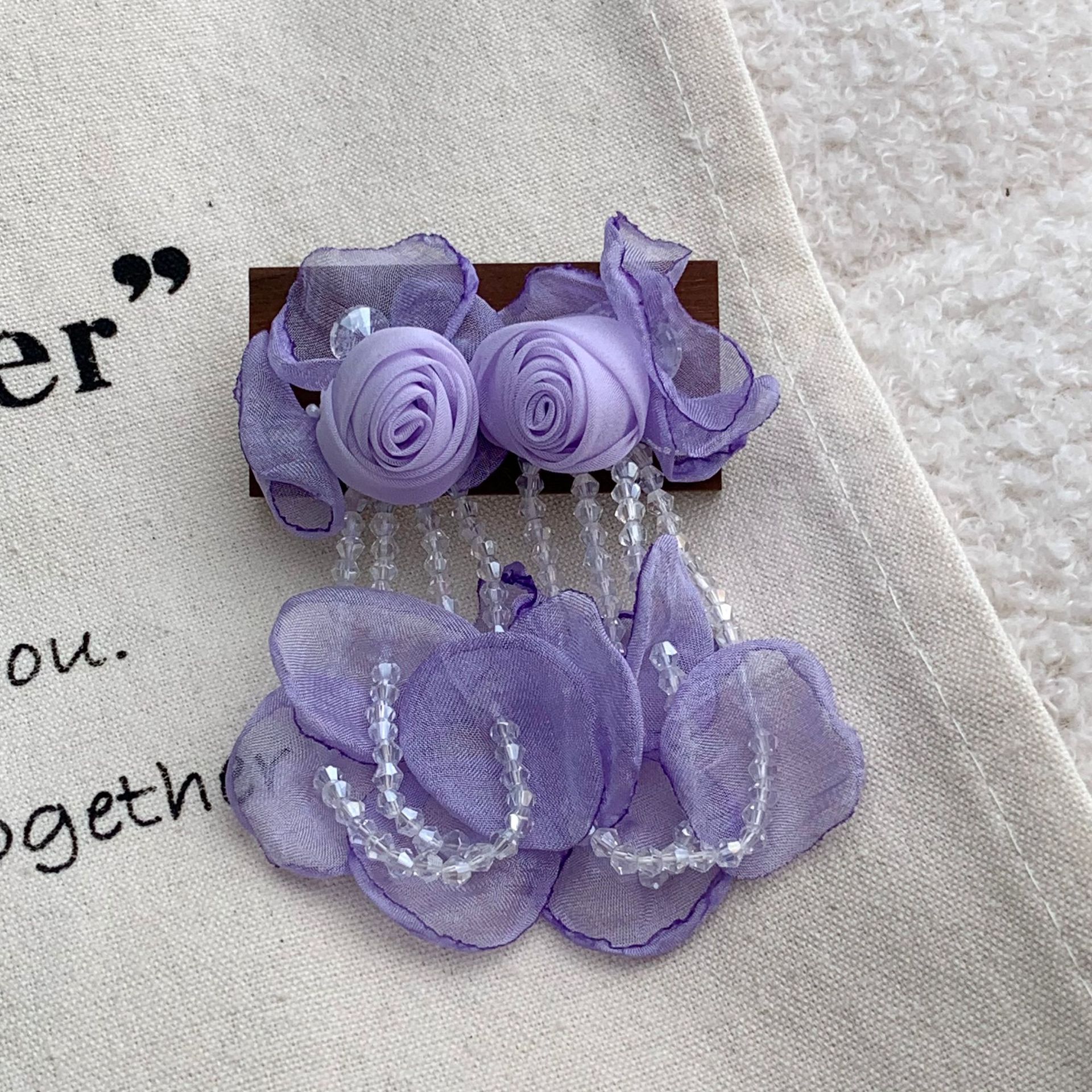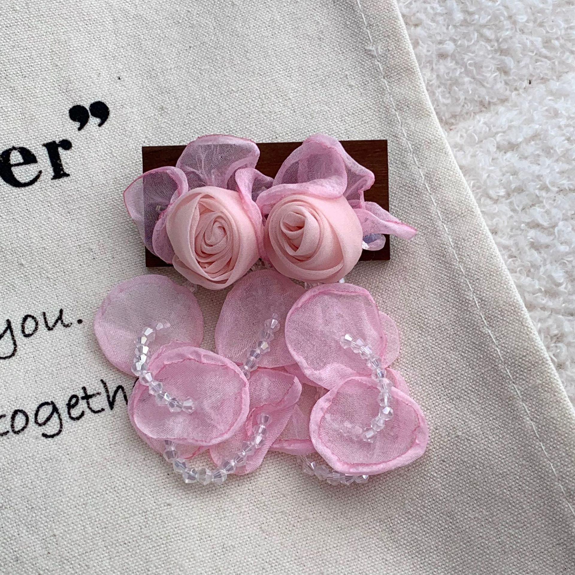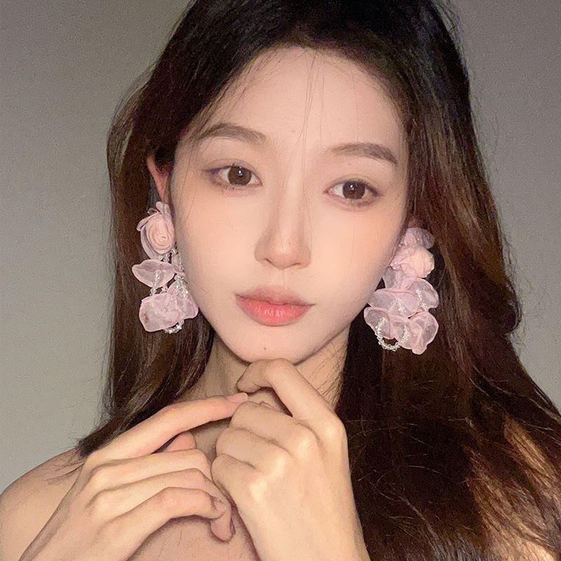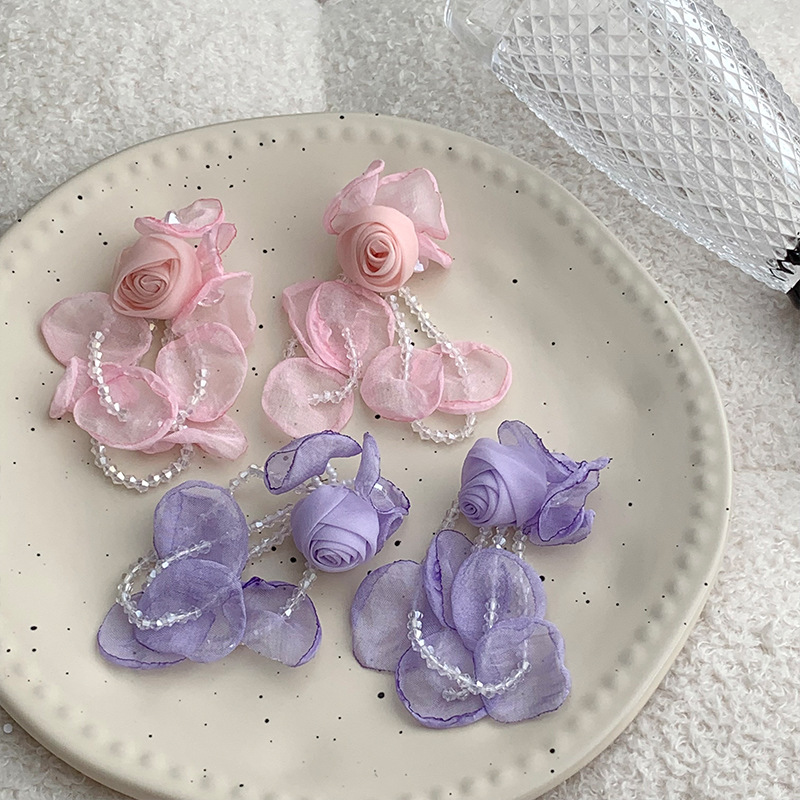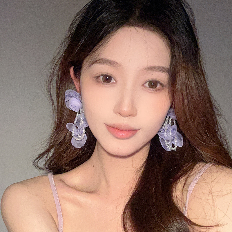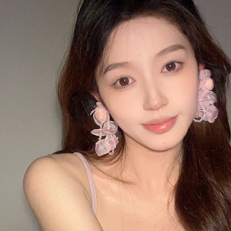 度假风花朵水晶流苏耳环气质夸张小众欧根纱长款耳钉年新款潮