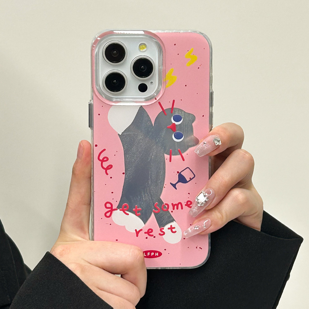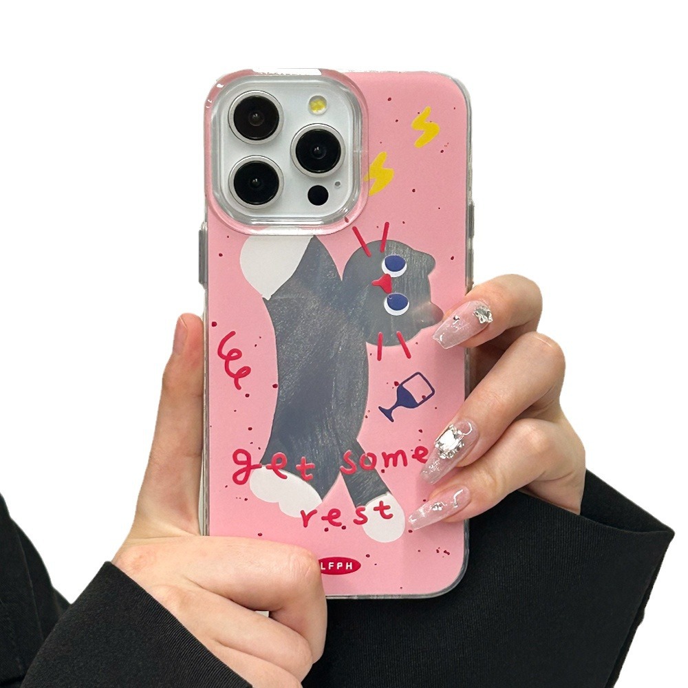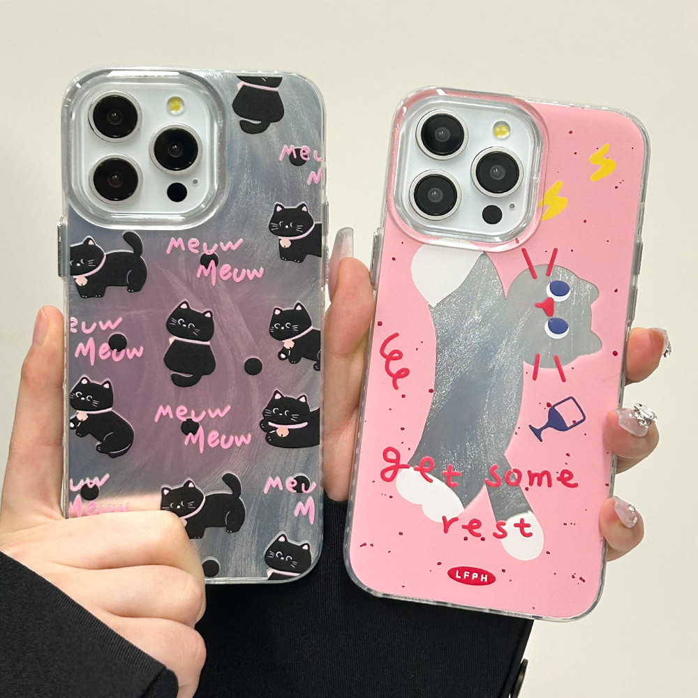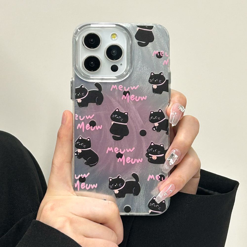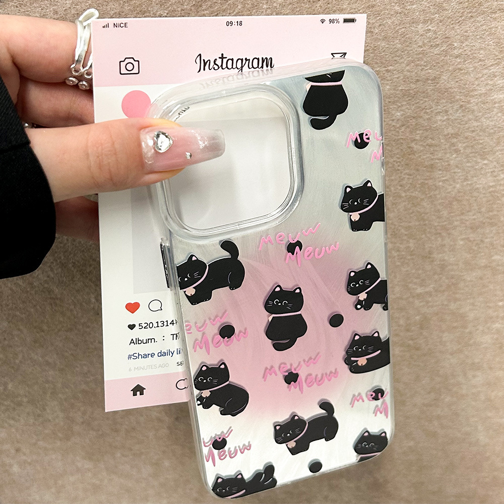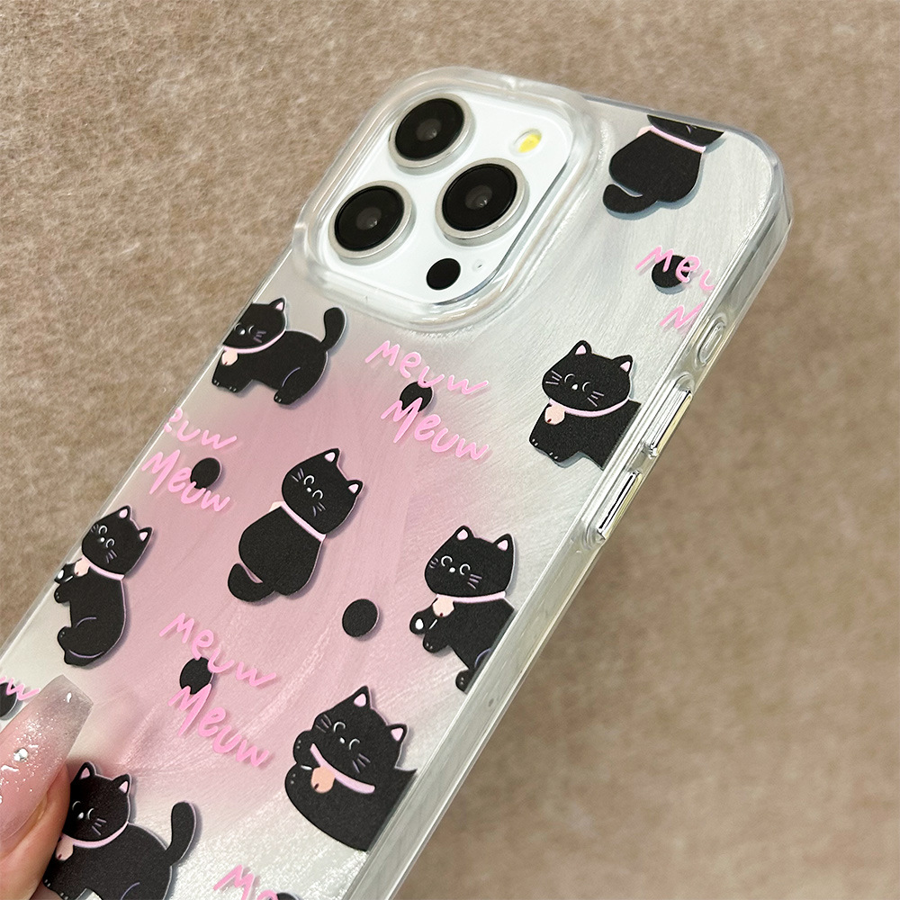 粉猫咪15promax手机壳14plus黑猫iPhone13苹果保护套xsmax透明边7