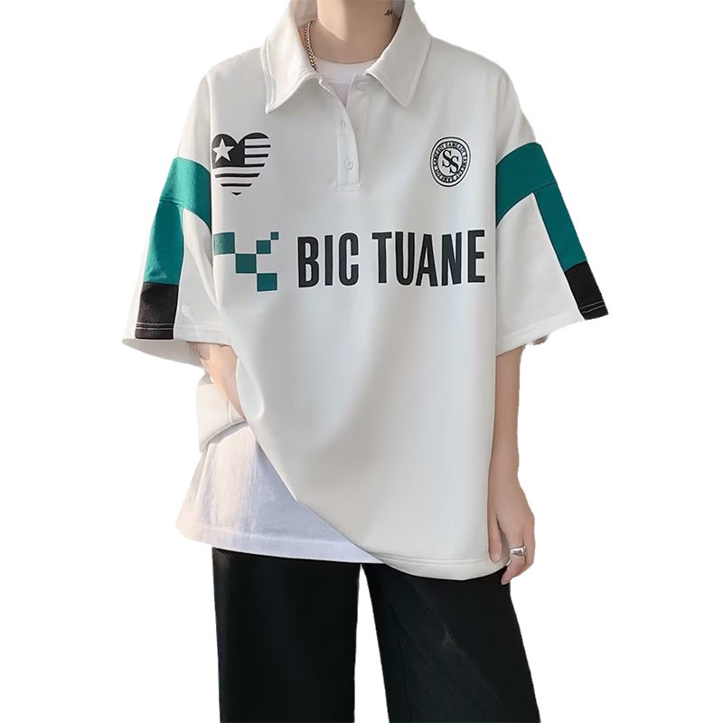撞色五分袖polo衫港风日系短袖男夏季带领t恤设计感oversize半袖