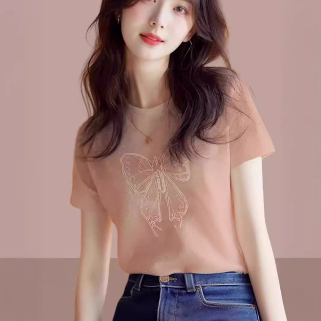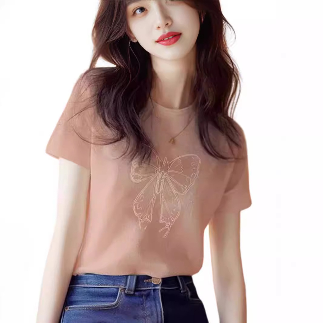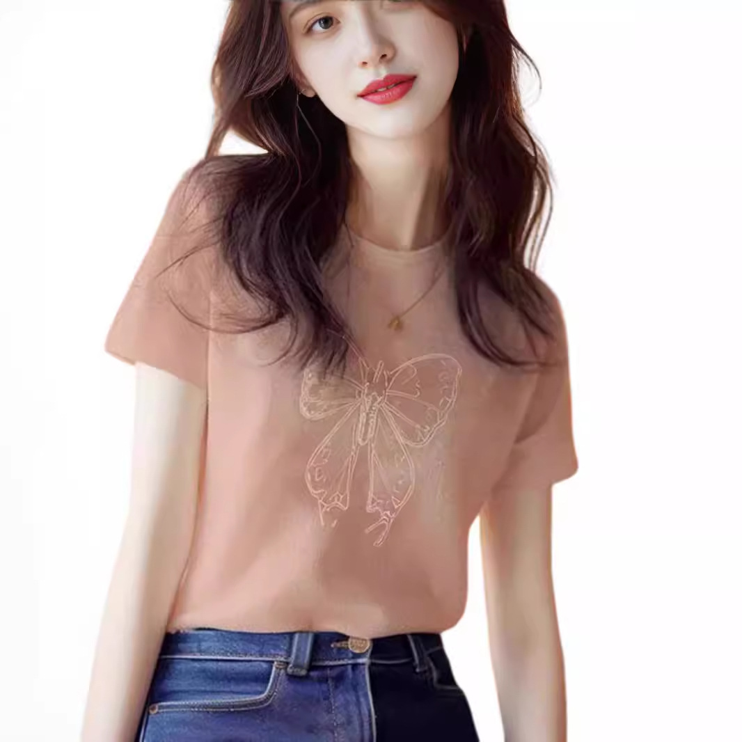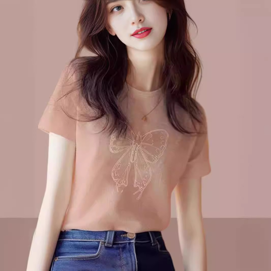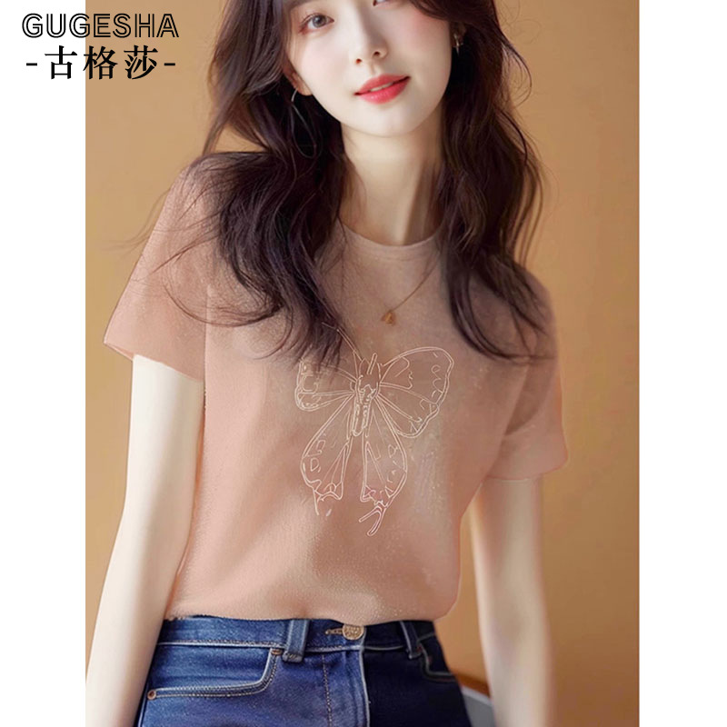 正肩纯棉圆领短袖t恤女2025新款时尚百搭洋气杏色上衣打底衫夏季