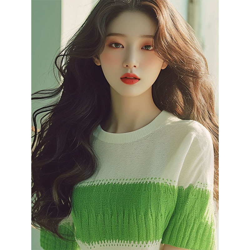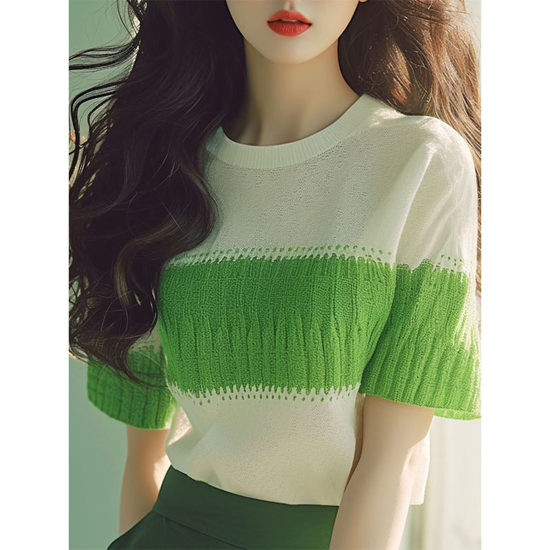 今年流行爆款上衣设计感小众别致绿色拼色针织短袖t恤女新款