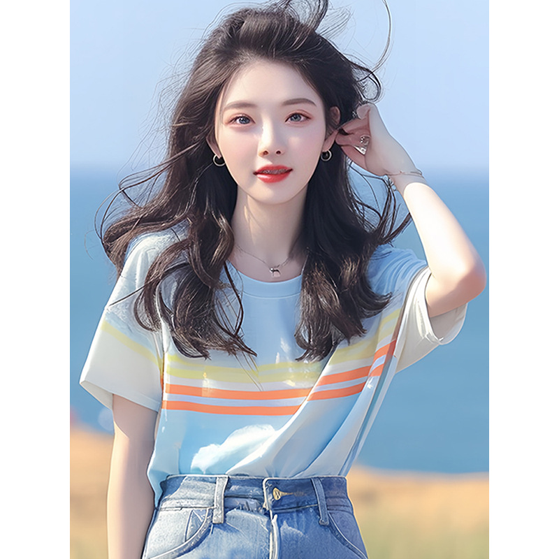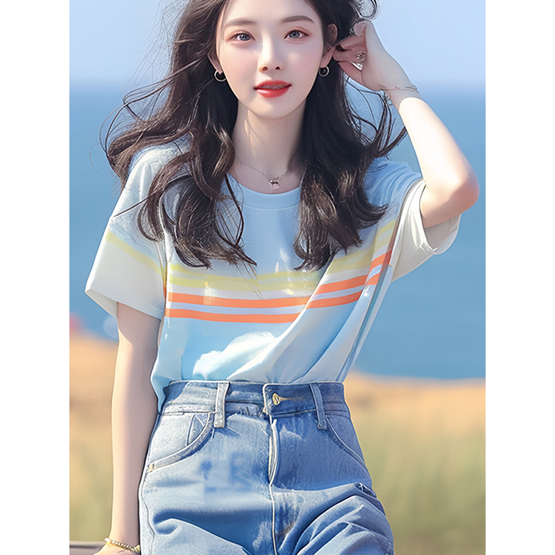 韩系chic洋气独特超好看上衣别致绝美百搭蓝色条纹短袖t恤女夏季