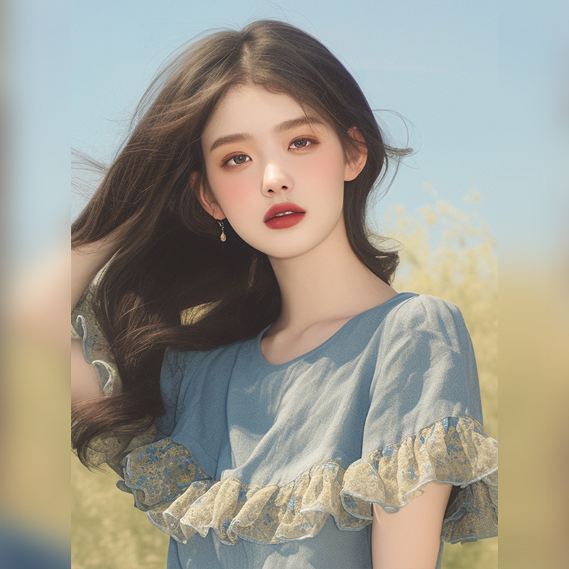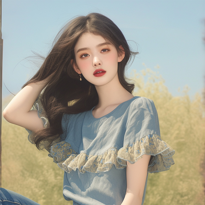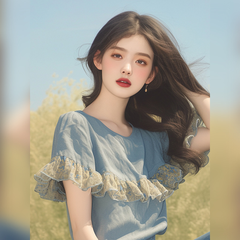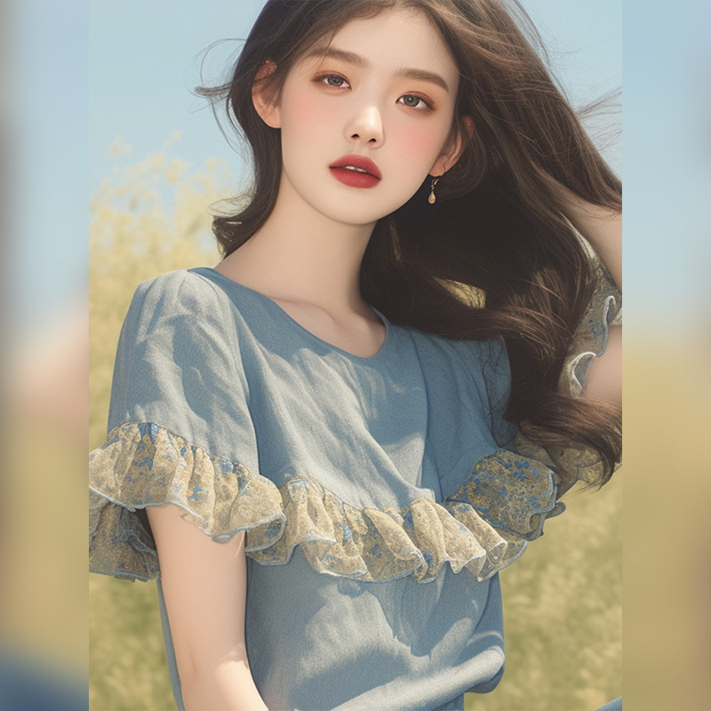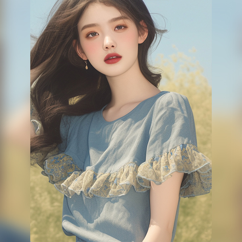 初夏流行小众设计感上衣法式洋气减龄气质绝美蓝色荷叶边拼接T恤