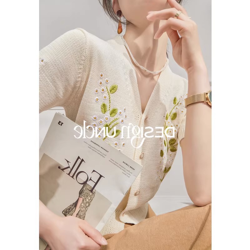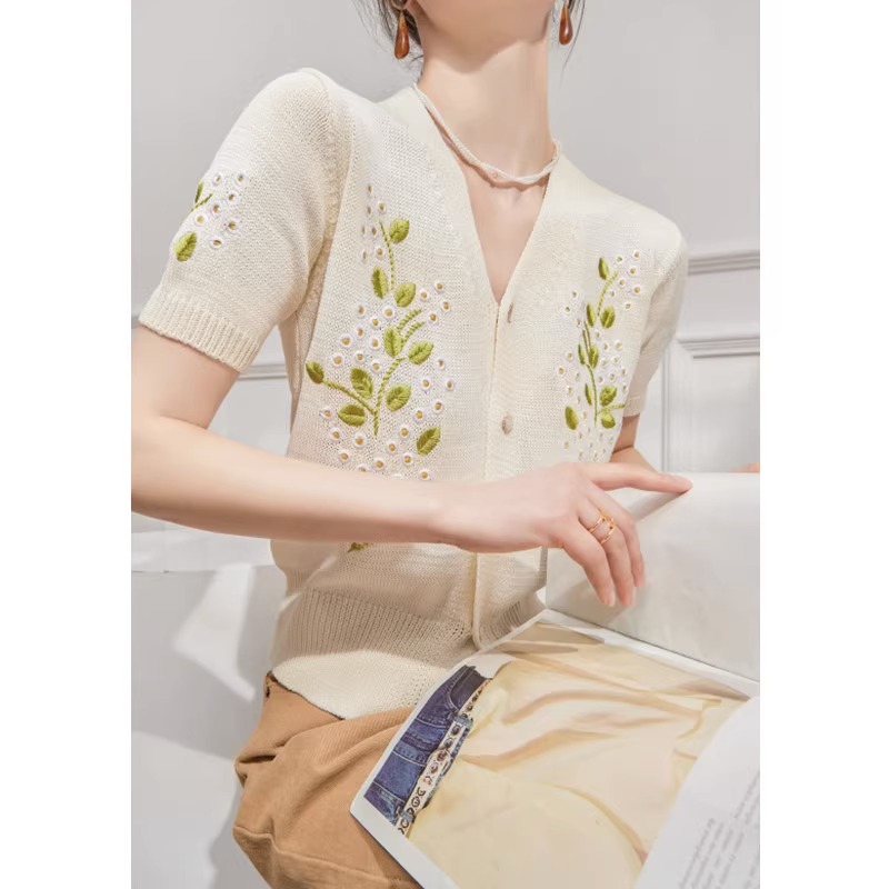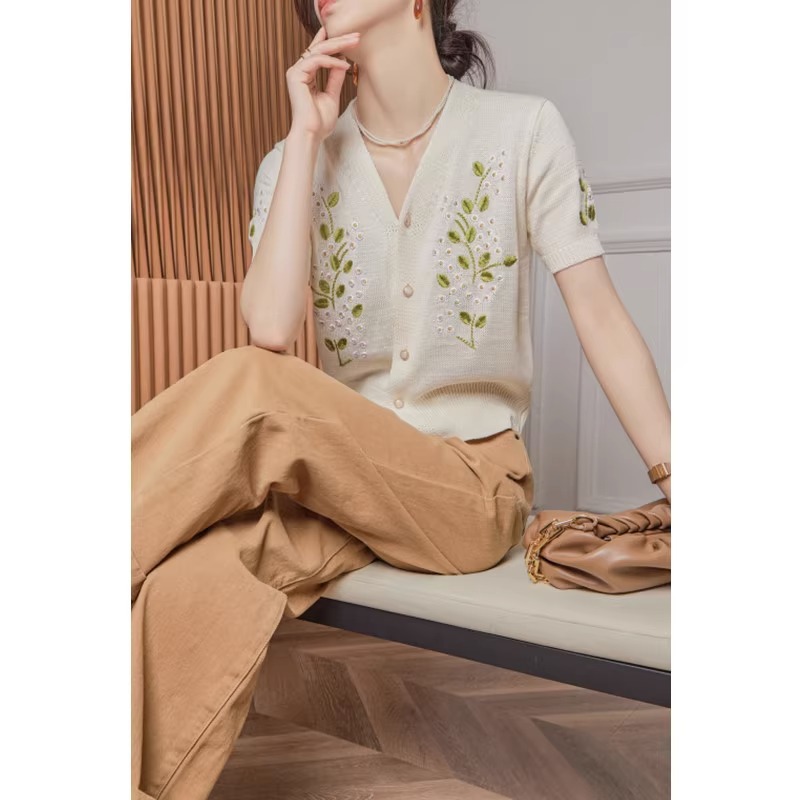 气质V领刺绣花朵镂空冰丝针织开衫夏季薄款洋气减龄别致短袖上衣