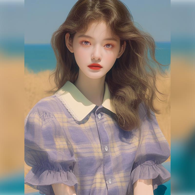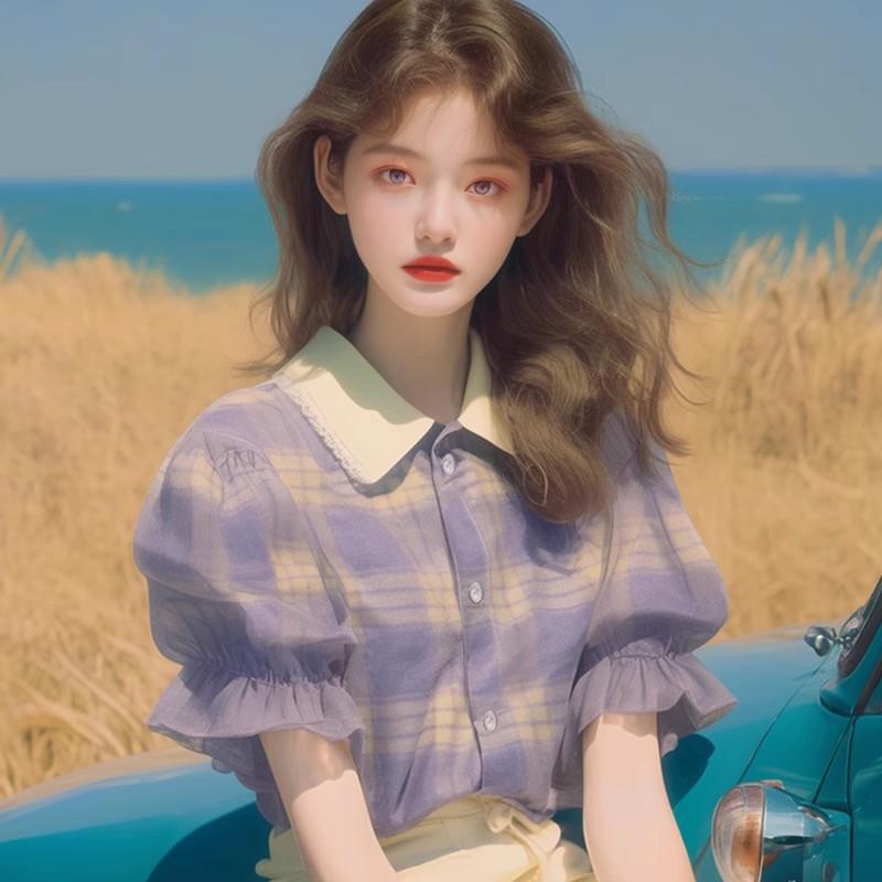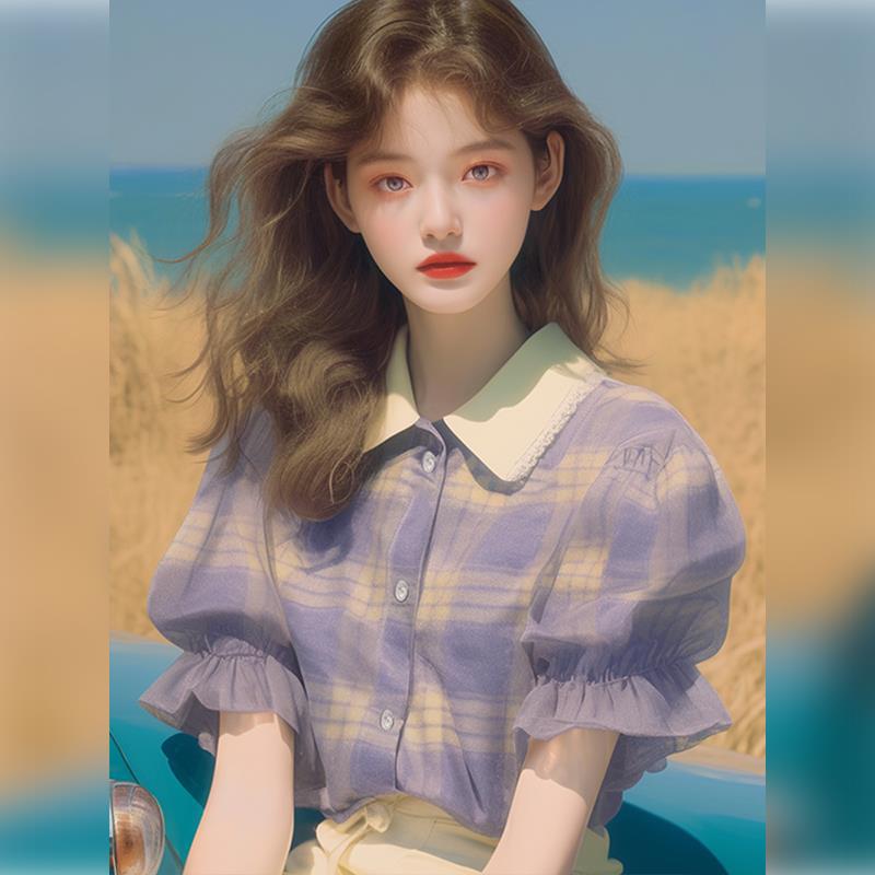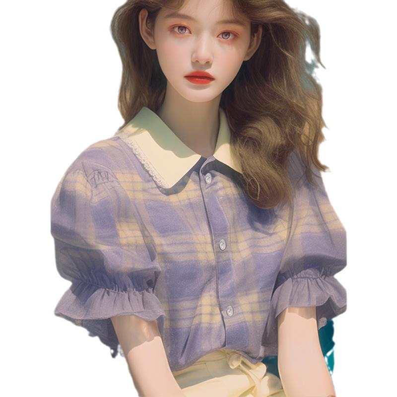 夏季流行爆款漂亮上衣小个子时髦洋气韩系甜美紫色格纹泡泡袖衬衫