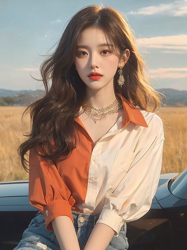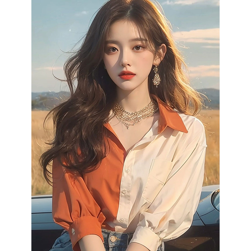 夏季气质上衣女新款高级感洋气高端别致小衫橙色拼色防晒衬衫