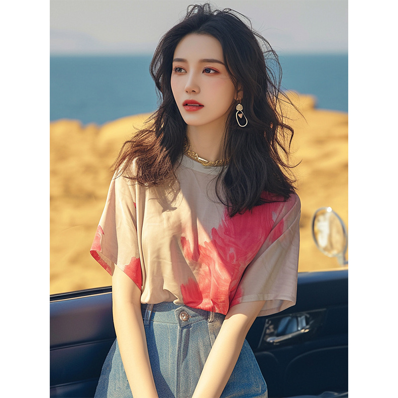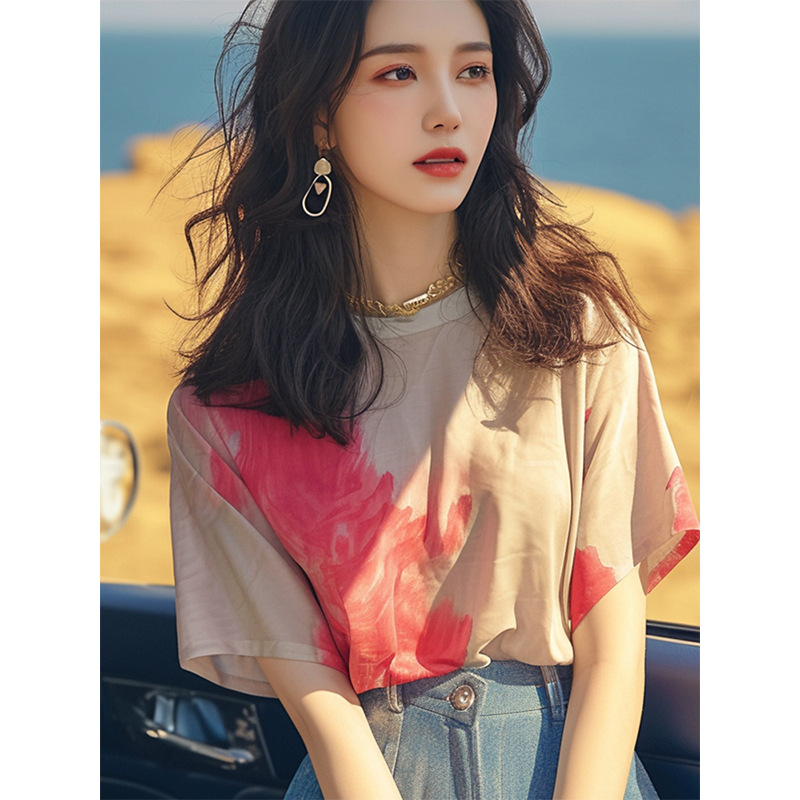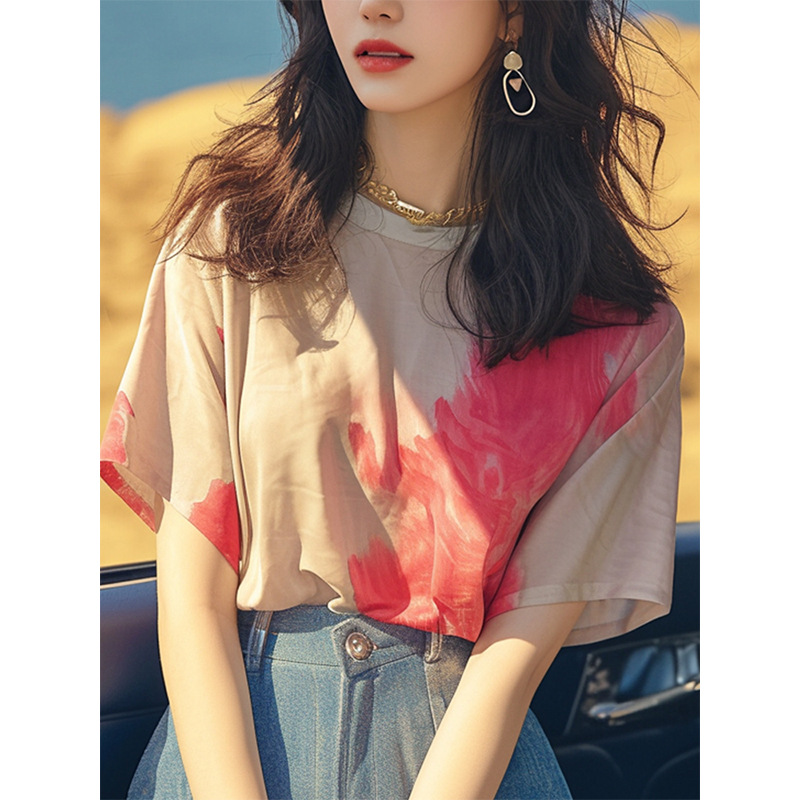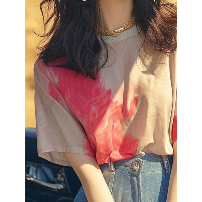 洋气独特超好看别致绝美漂亮宽松小上衣杏色晕染正肩短袖t恤女夏