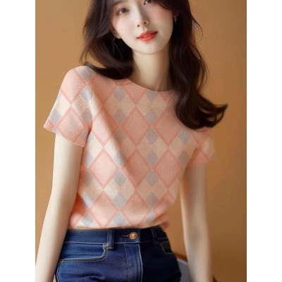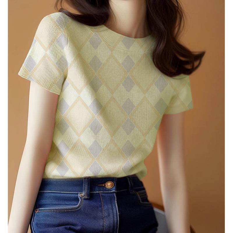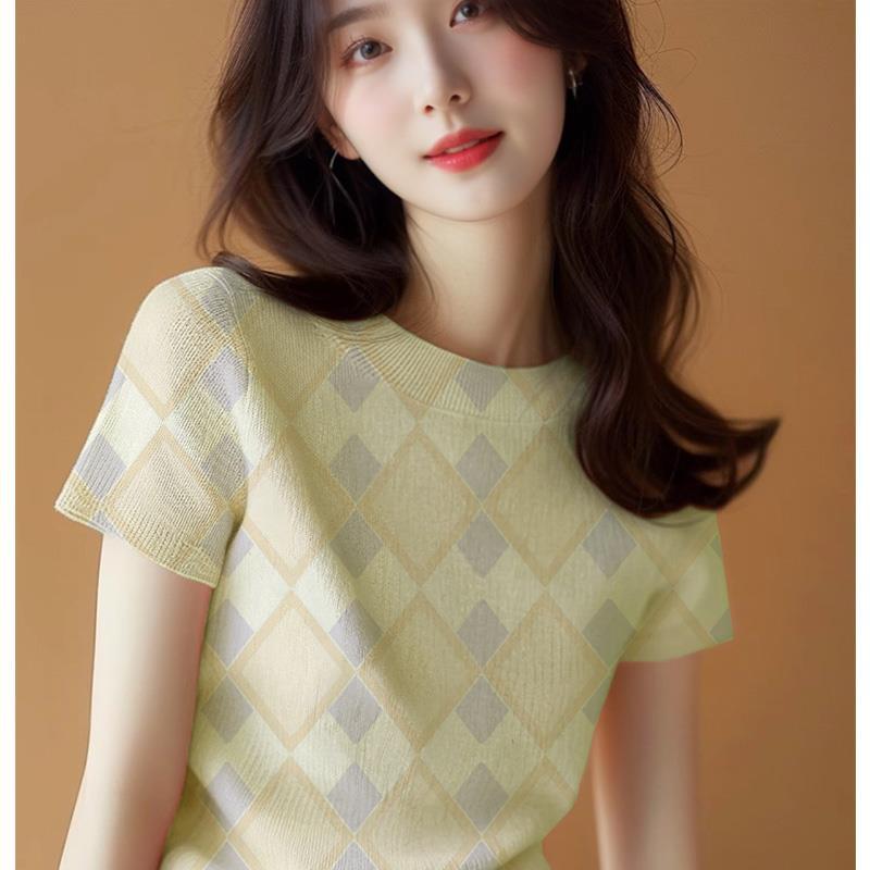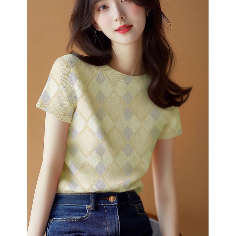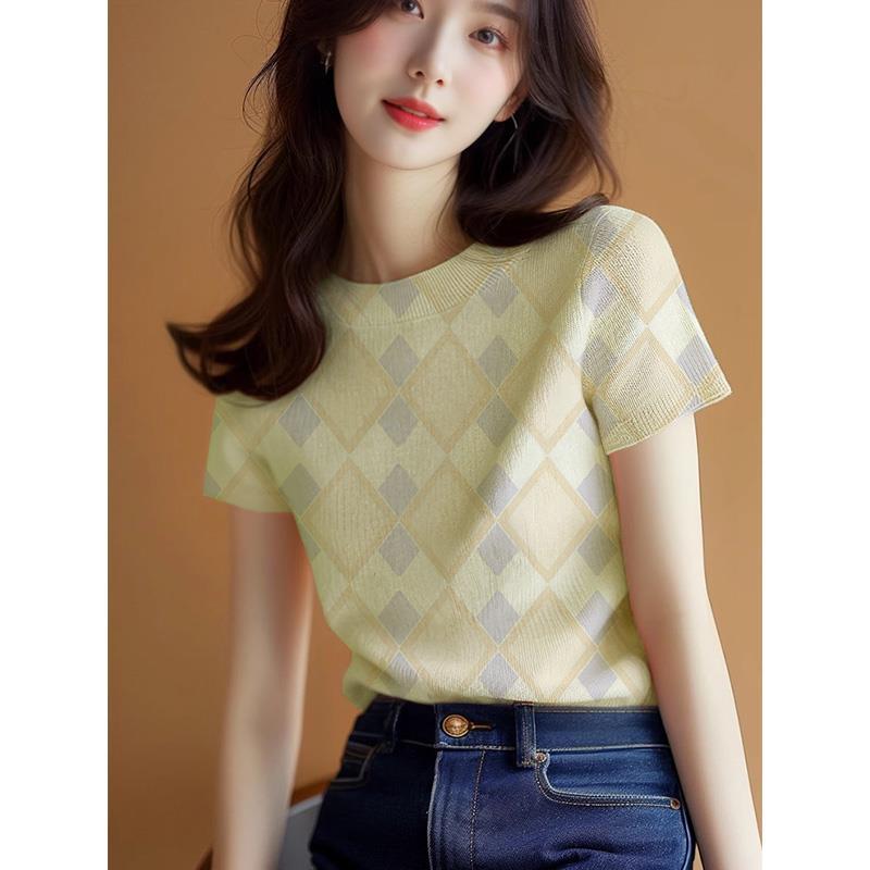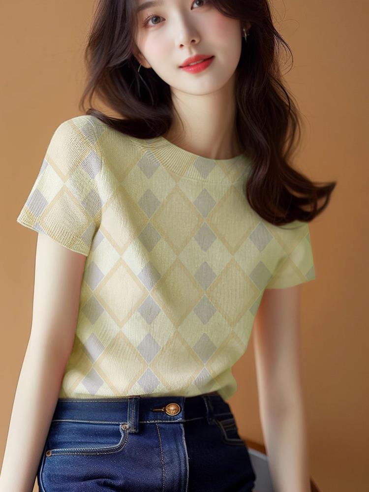 新款爆款设计感夏季气质上衣黄色针织修身正肩短袖t恤女夏款