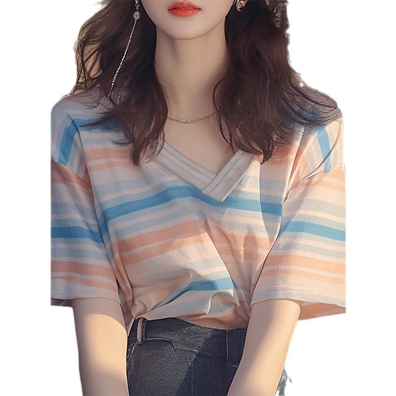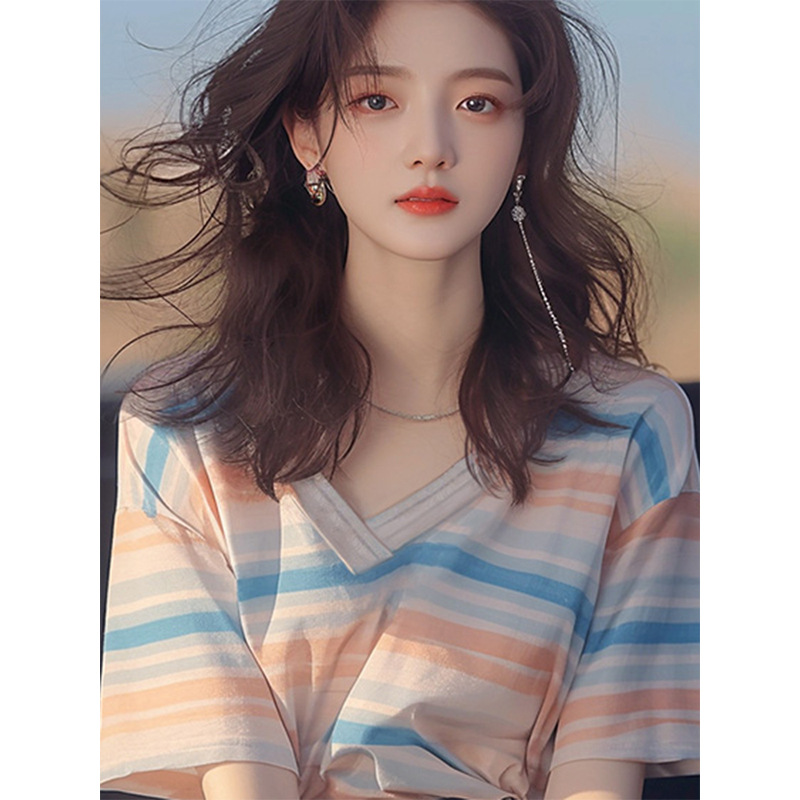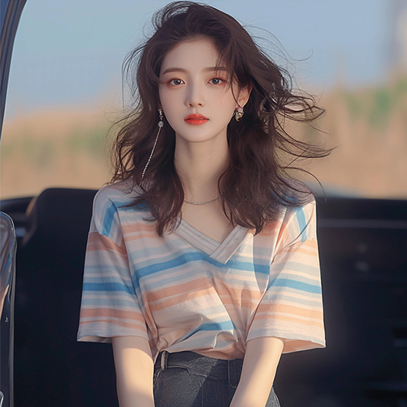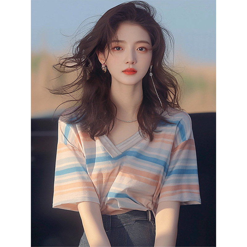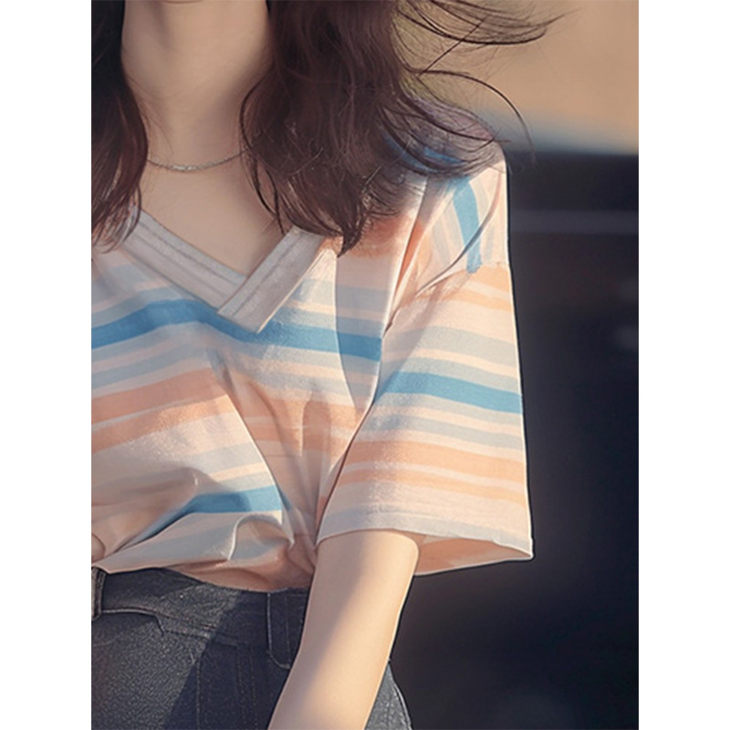 夏季韩系chic洋气独特别致漂亮上衣宽松百搭显瘦条纹v领T恤女款