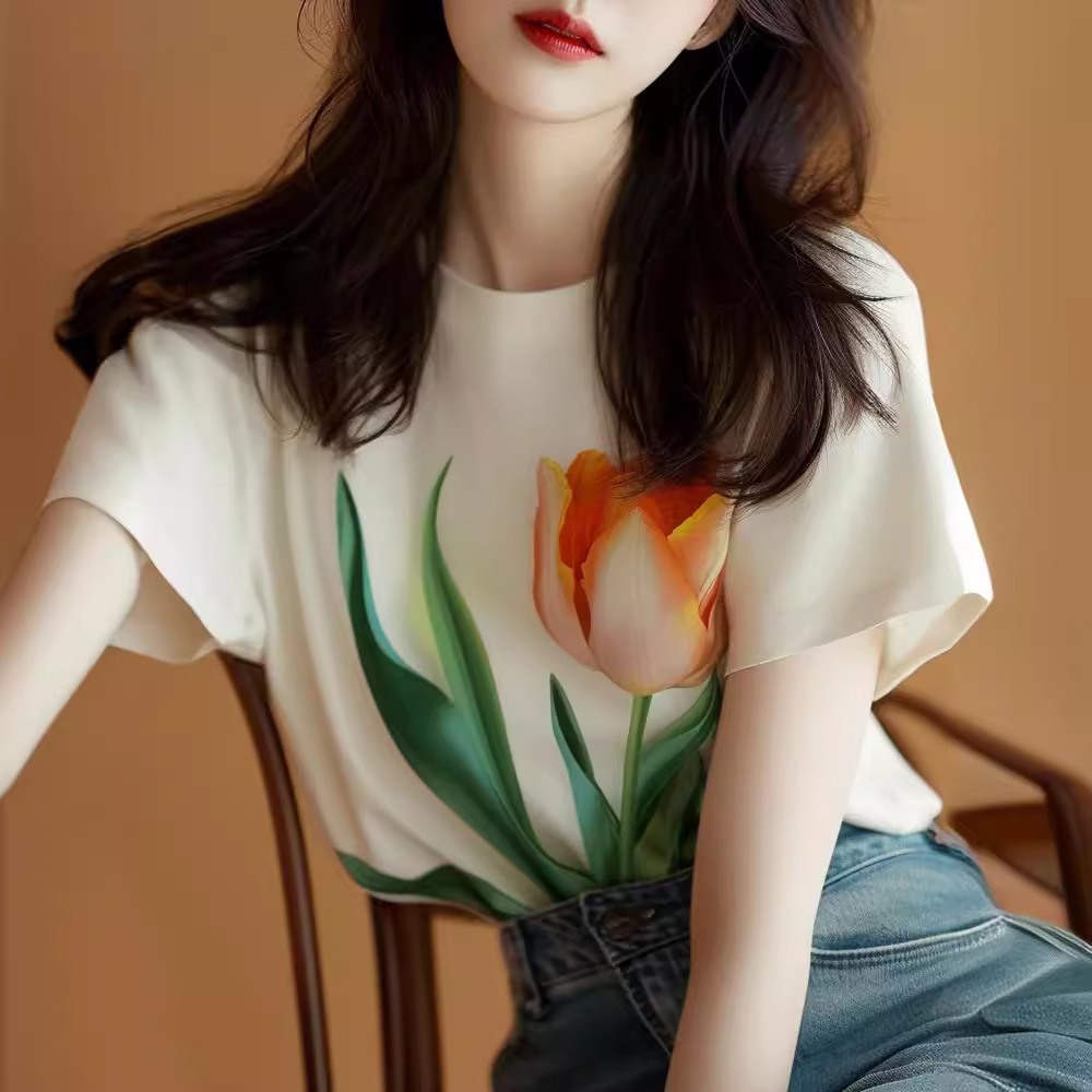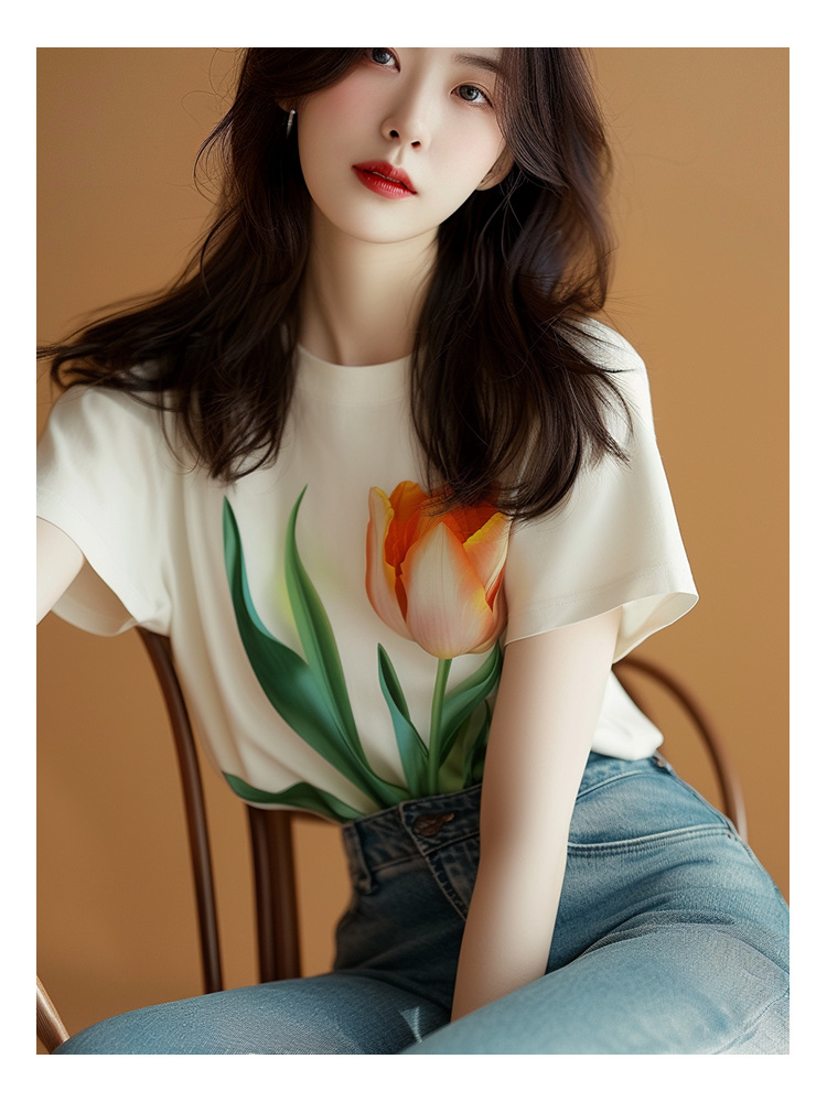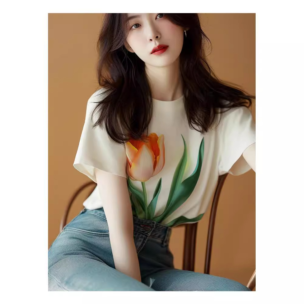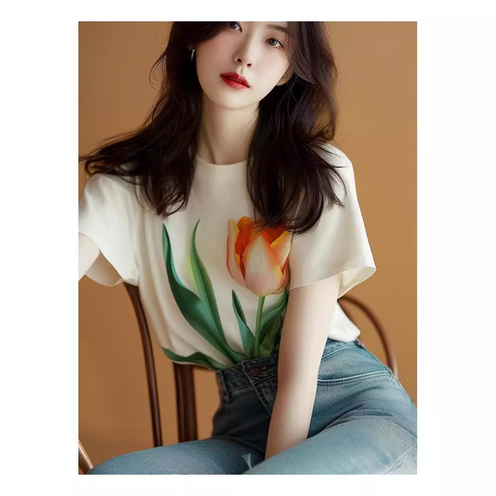 白色郁金香短袖t恤女新款高端上衣奢华正肩显瘦宽松体恤