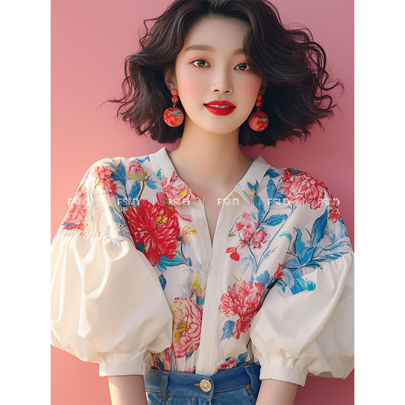 独特漂亮小衫淑女气质法式小上衣泡泡袖碎花衬衫新款女装夏季