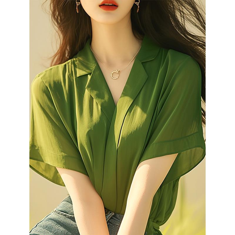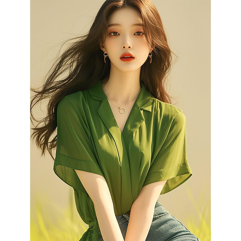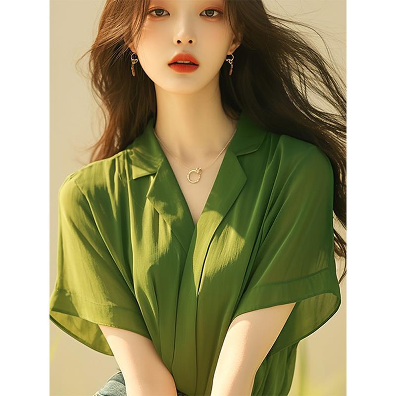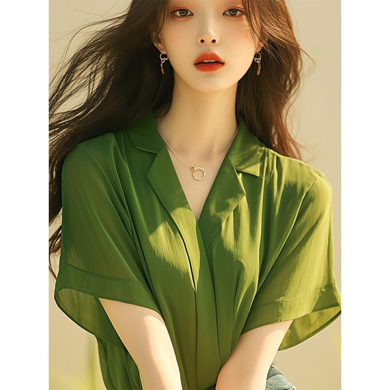 法式设计绝美上衣今年流行的薄荷曼波风绿色短袖雪纺衬衫女装夏季