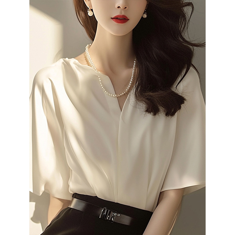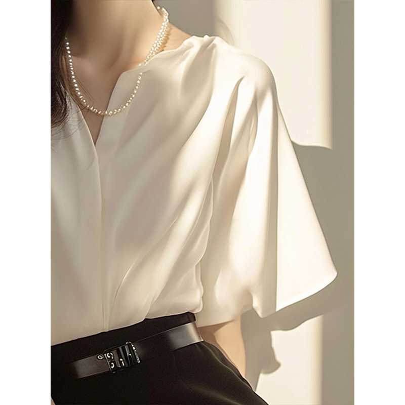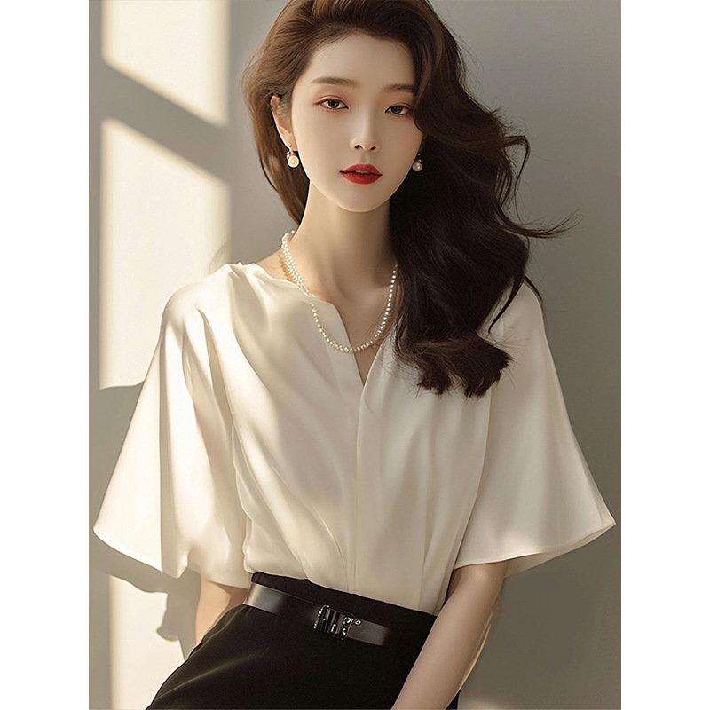 轻熟法式小众风情万种的高端上衣奢华高端绝美白色醋酸缎面衬衫夏