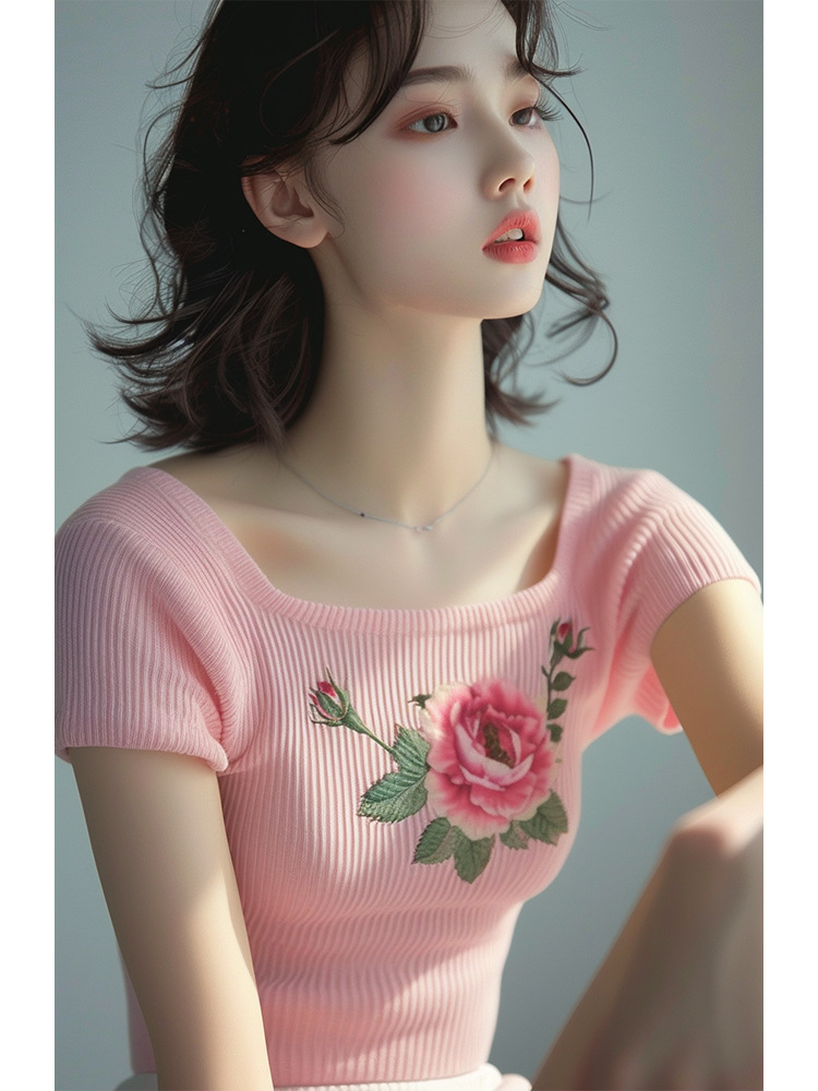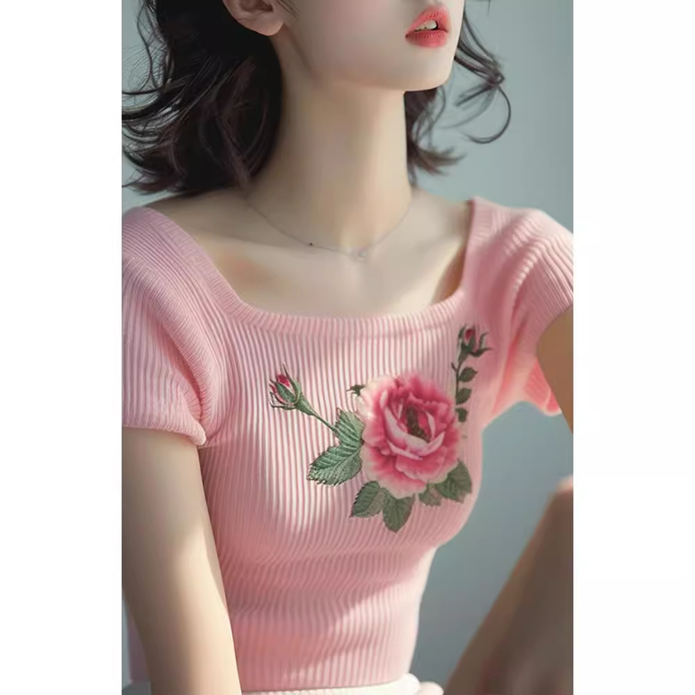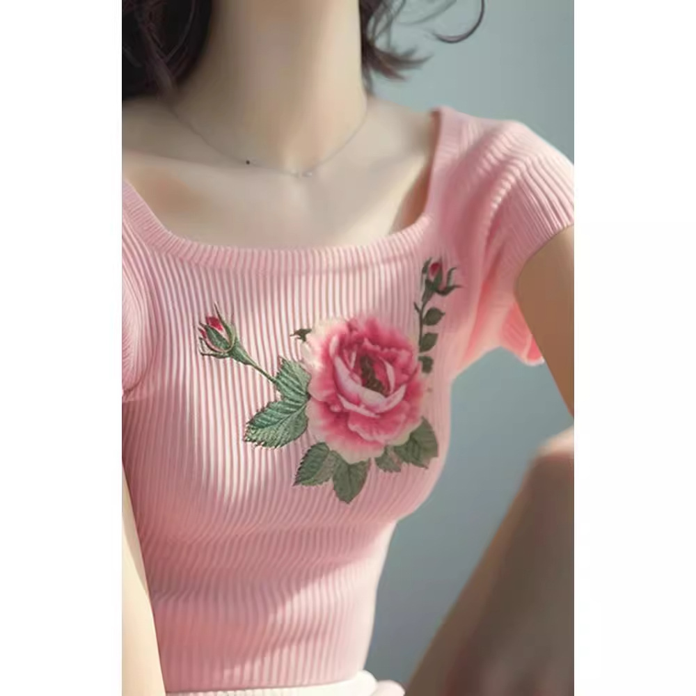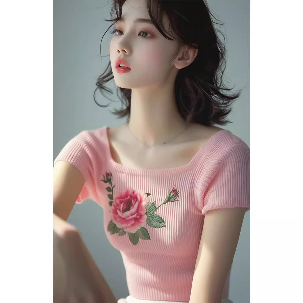 粉色印花针织短袖t恤女新款夏天多巴胺气质名媛女神范短上衣