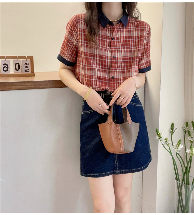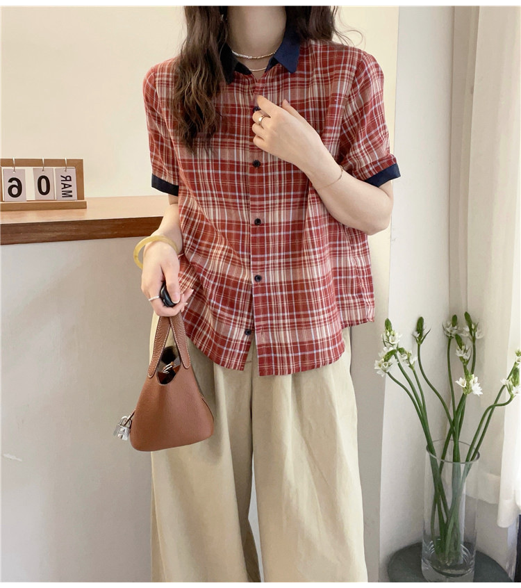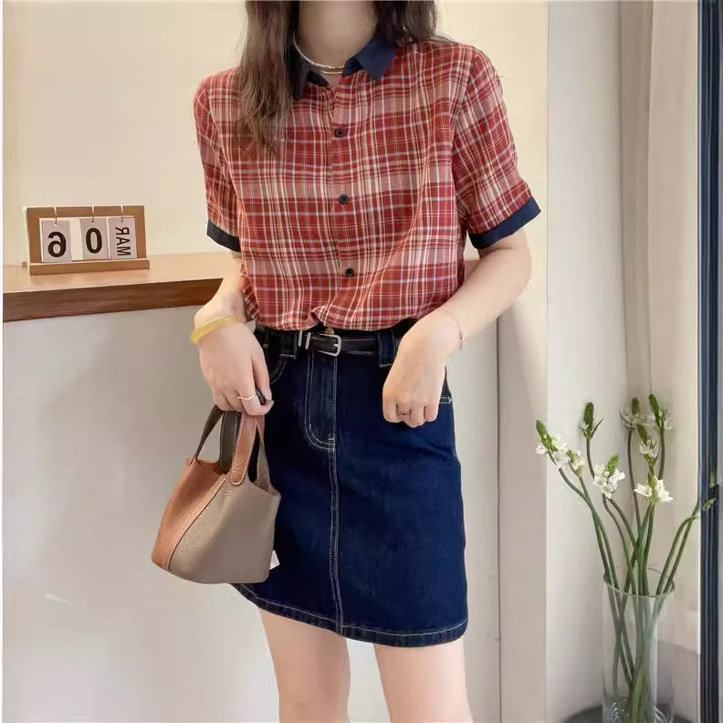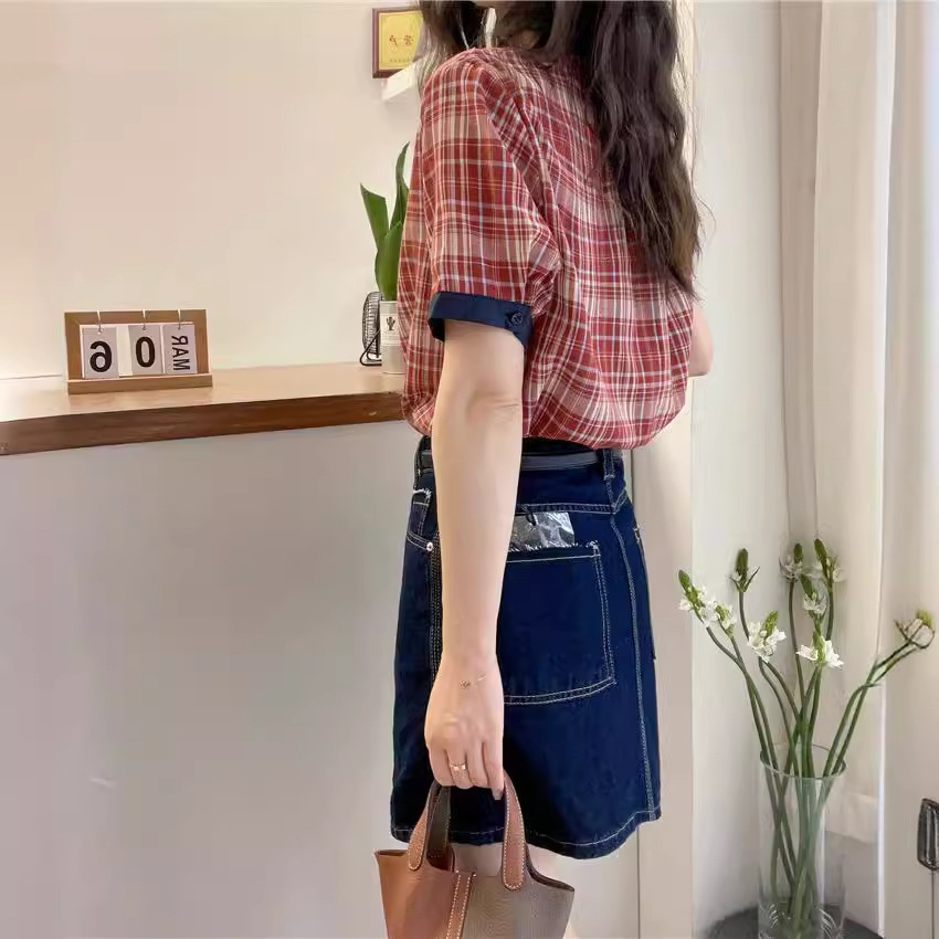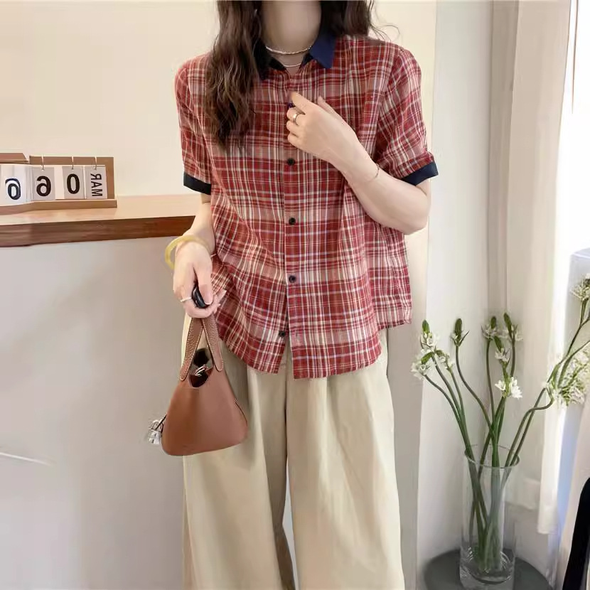红色格子翻领短袖衬衫女欧洲站夏装新款欧货女装A字娃娃衫潮