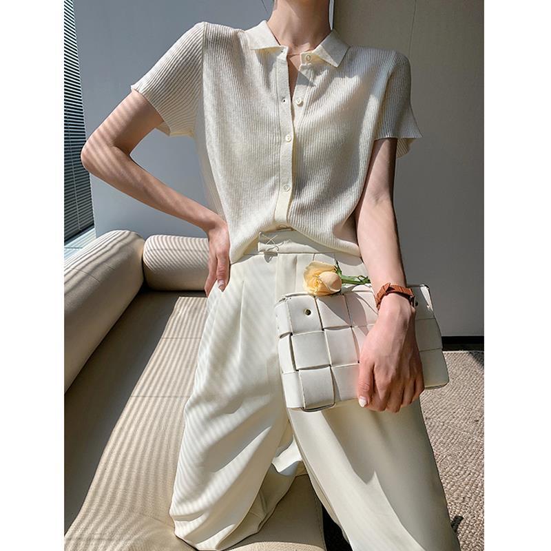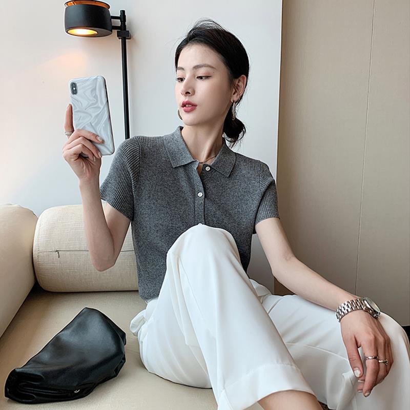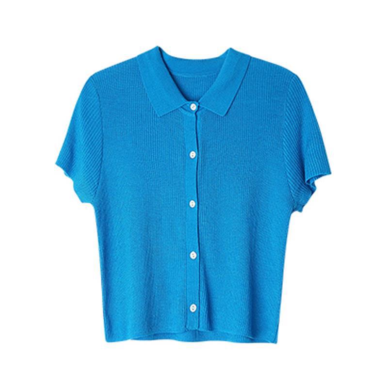 克莱因蓝色冰丝针织短袖polo衫女夏季薄款设计感小众上衣短款百搭