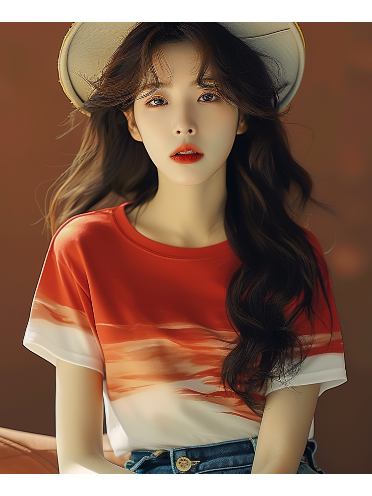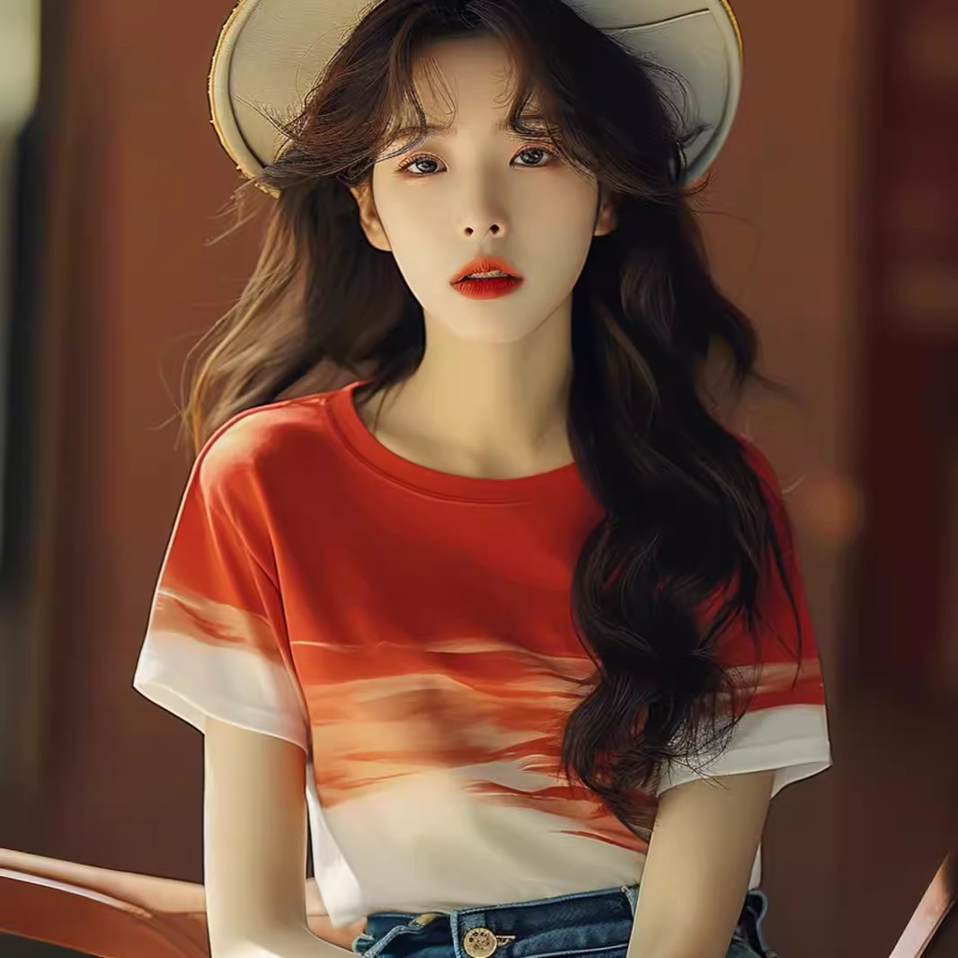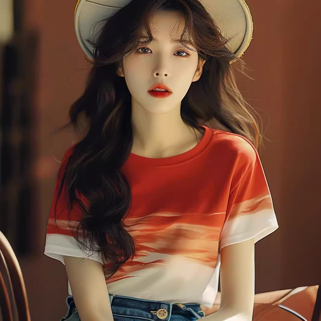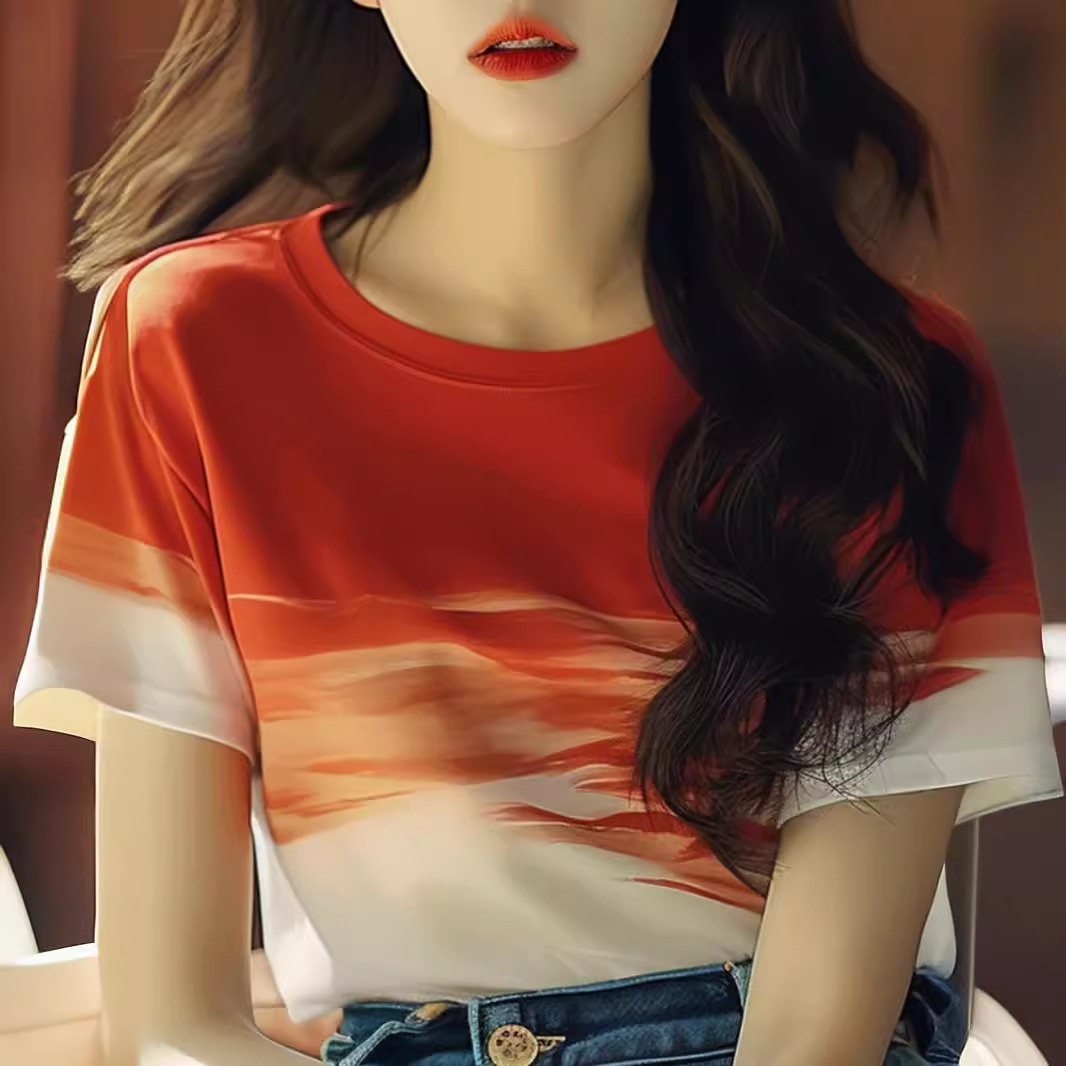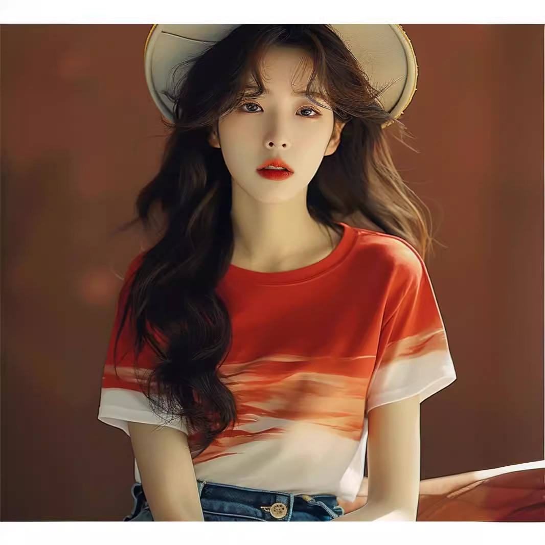红色撞色晕染短袖正肩t恤新款夏日多巴胺穿搭慵懒松弛感上衣