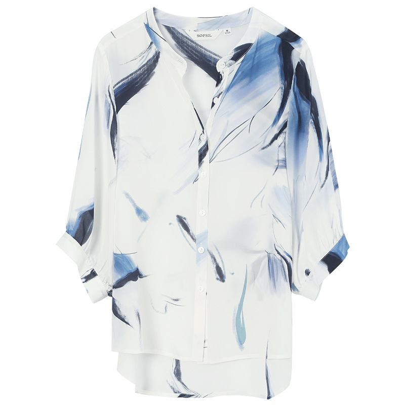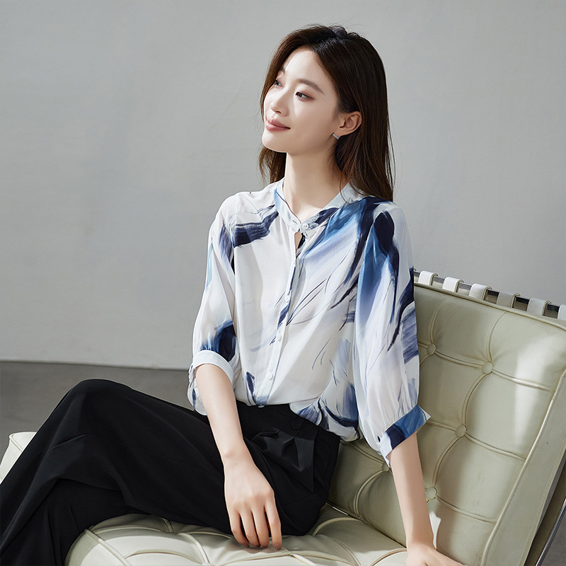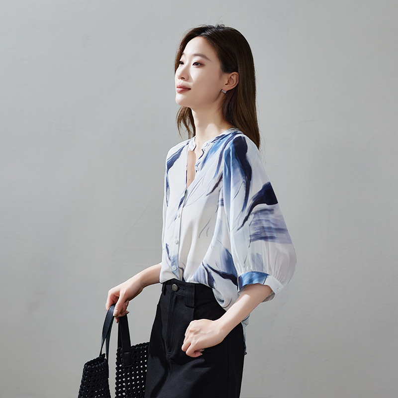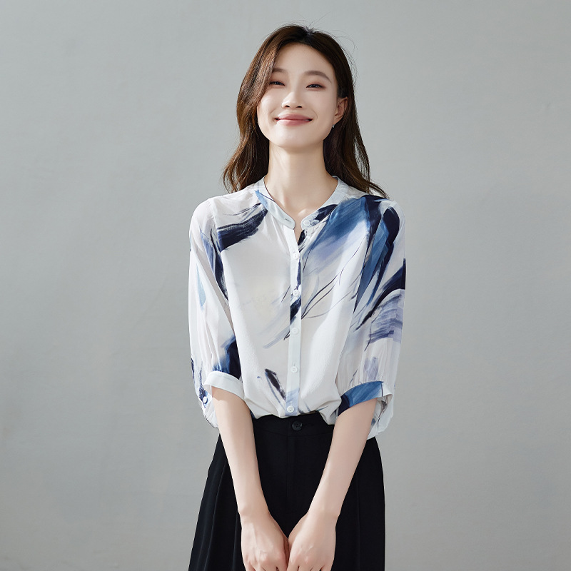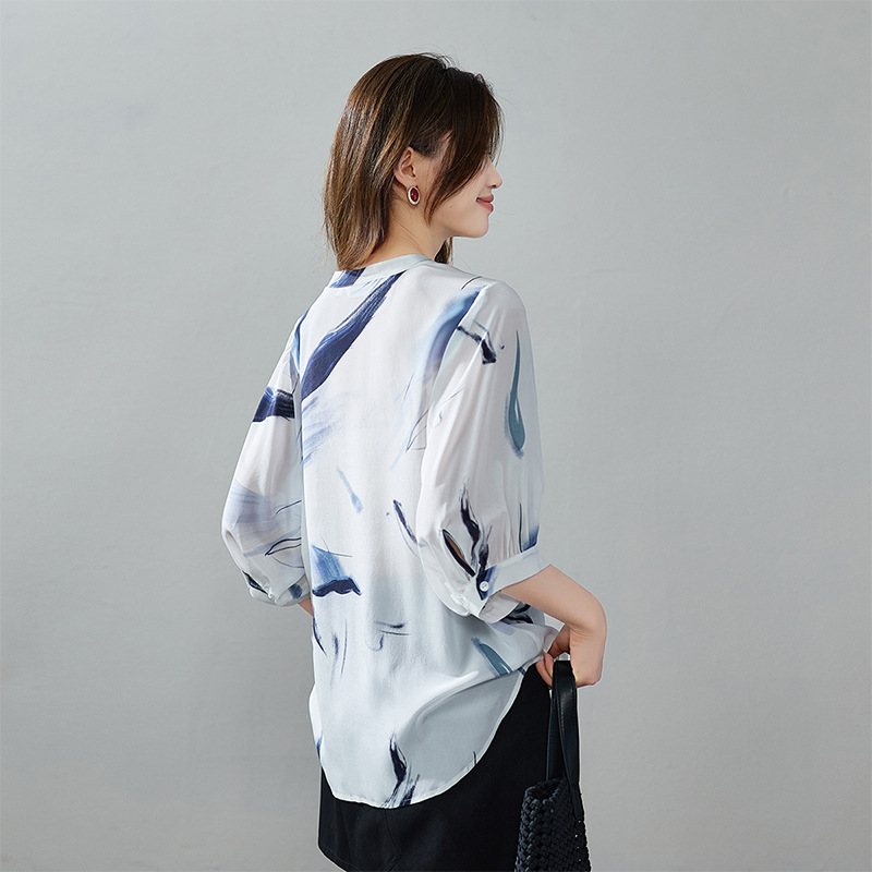 夏新款气质水墨印花桑蚕丝五分袖圆领衬衫女上衣衬衣