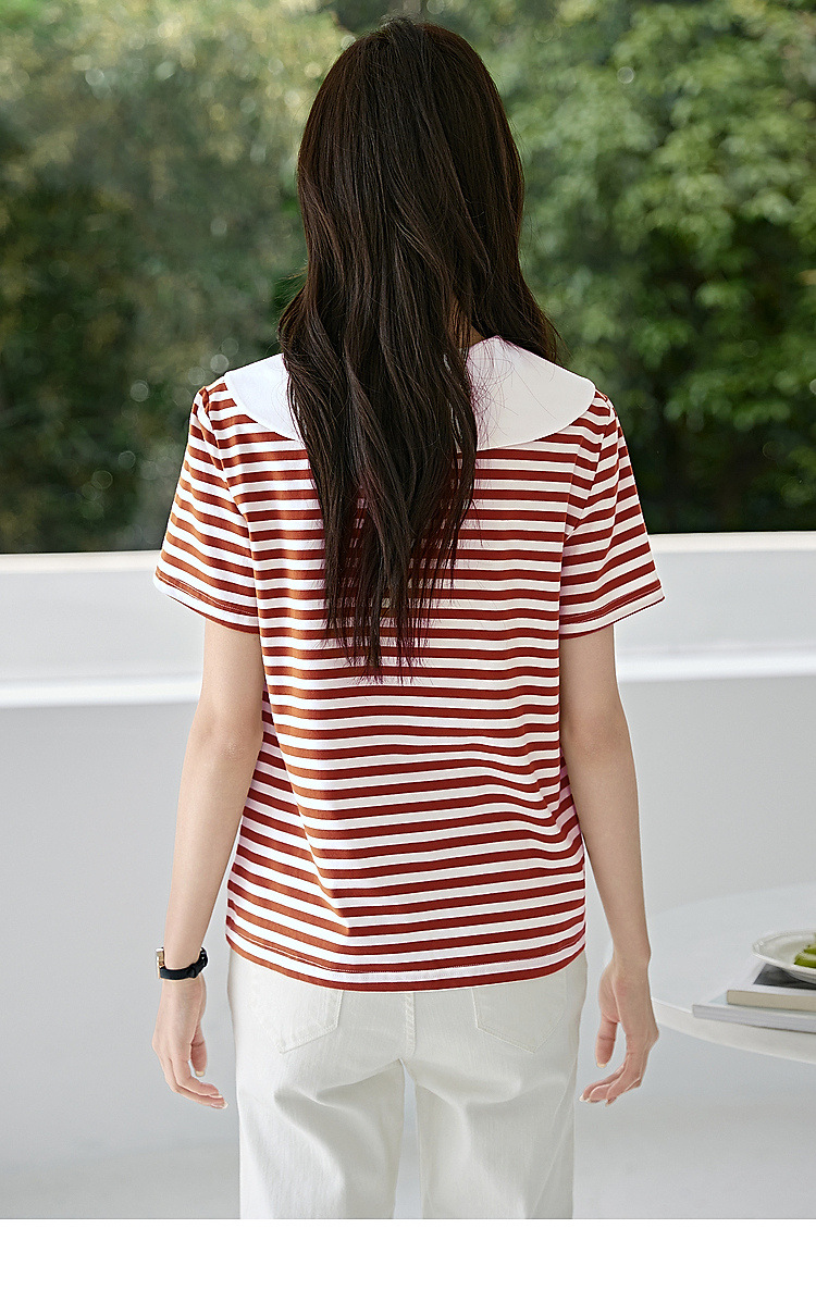 沫晗依美假日海军风清爽条纹大翻领T恤夏季新款撞色拼接短袖