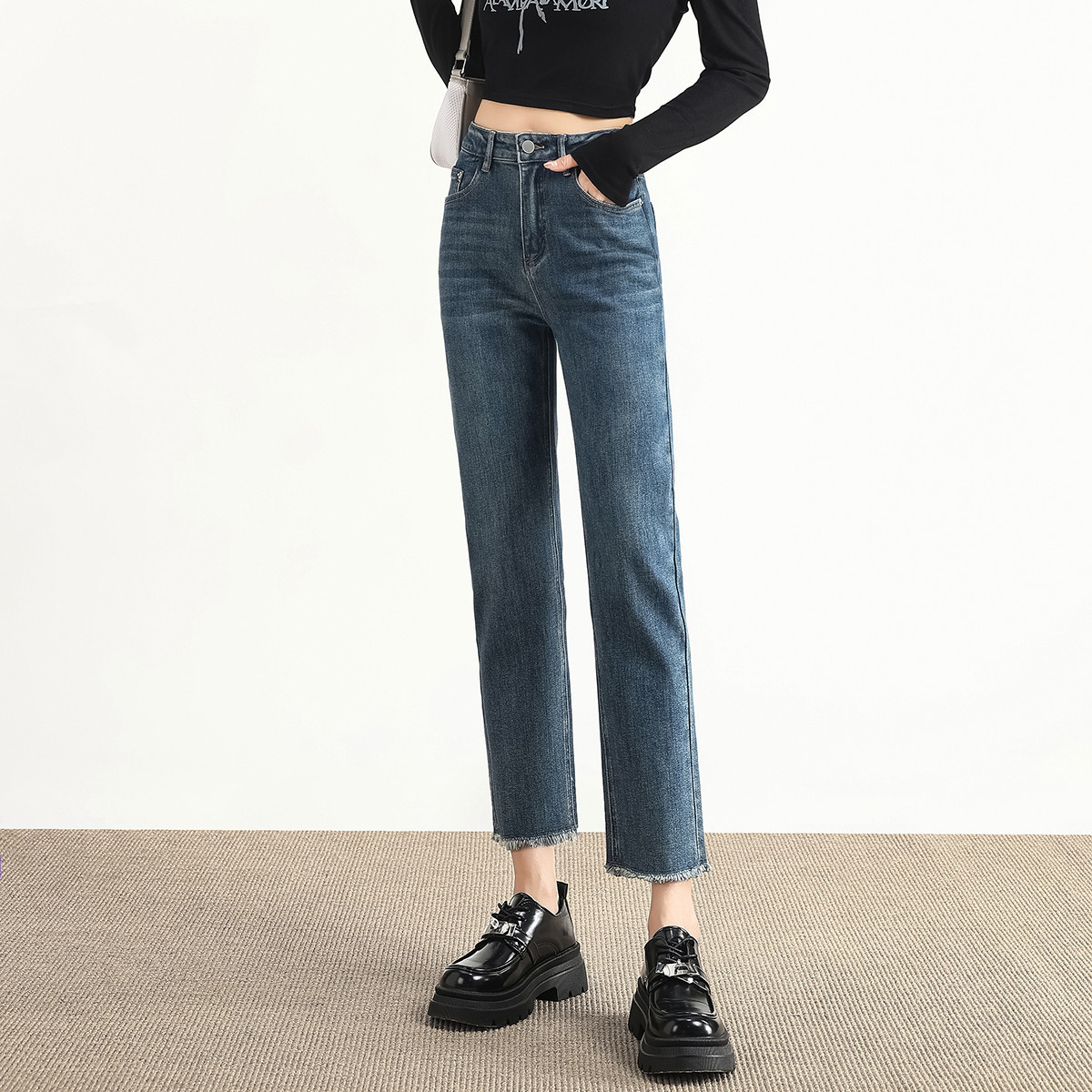 直筒牛仔裤女九分高腰显瘦春夏新款韩版弹力毛边烟管法棍牛仔裤女