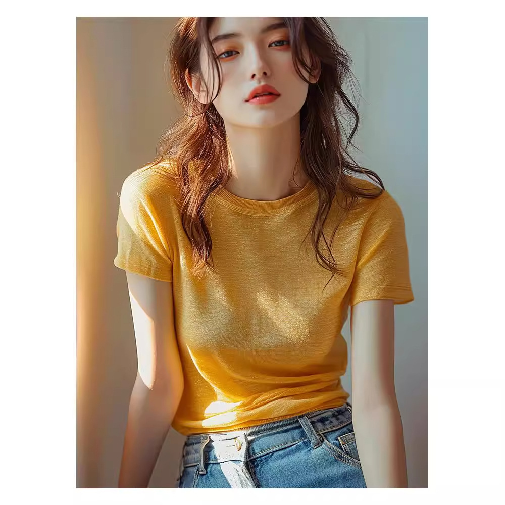 今年流行漂亮黄色针织短袖T恤女法式小香风圆领正肩高端洋气上衣