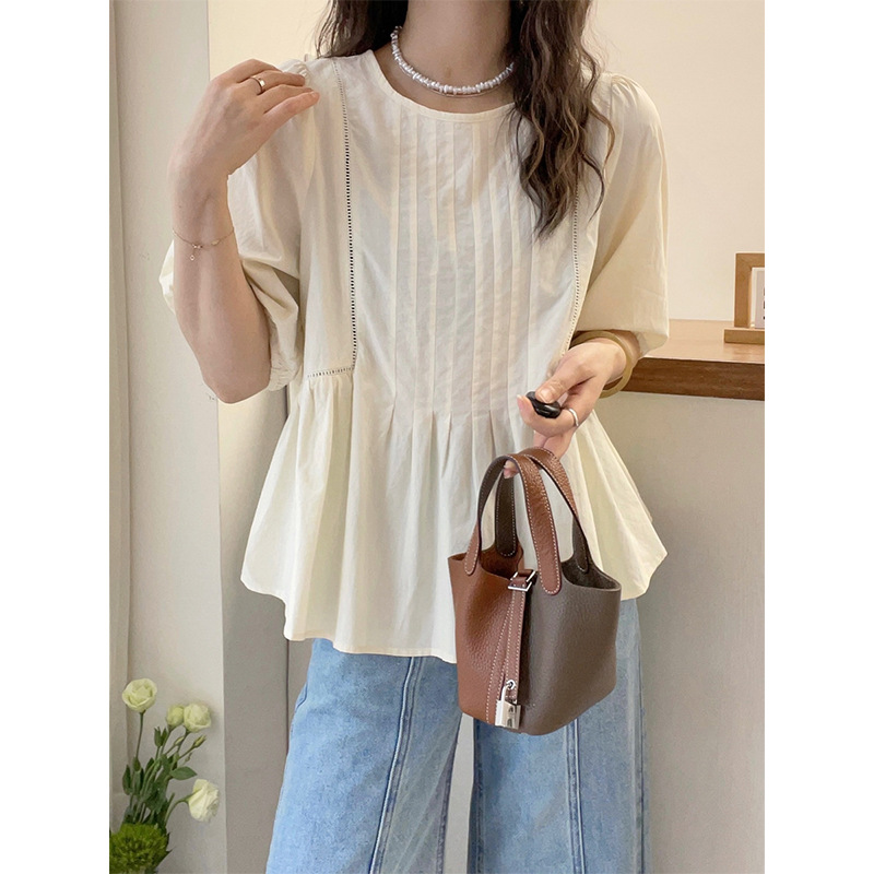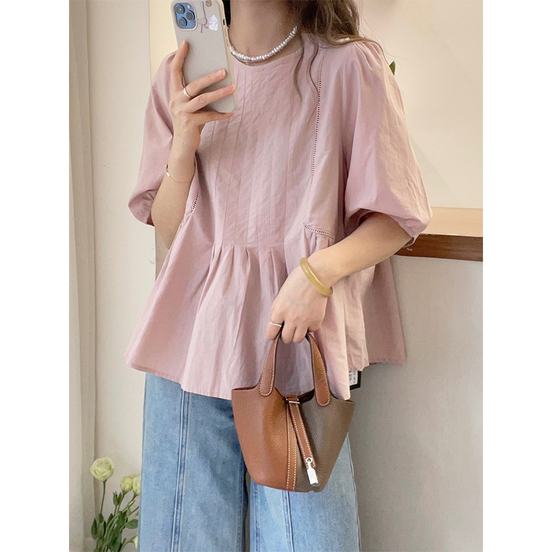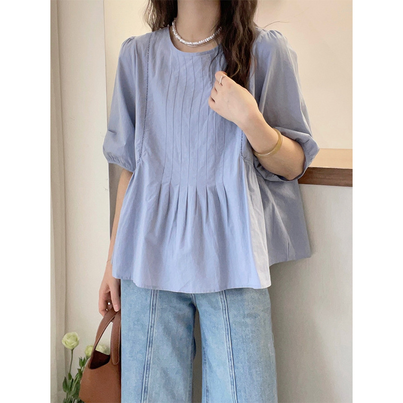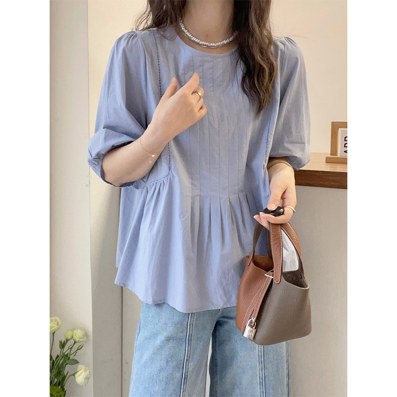 小众泡泡袖褶皱短袖衬衫女装夏季新款圆领套头时尚百搭小衫潮