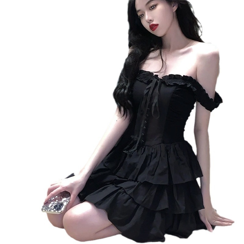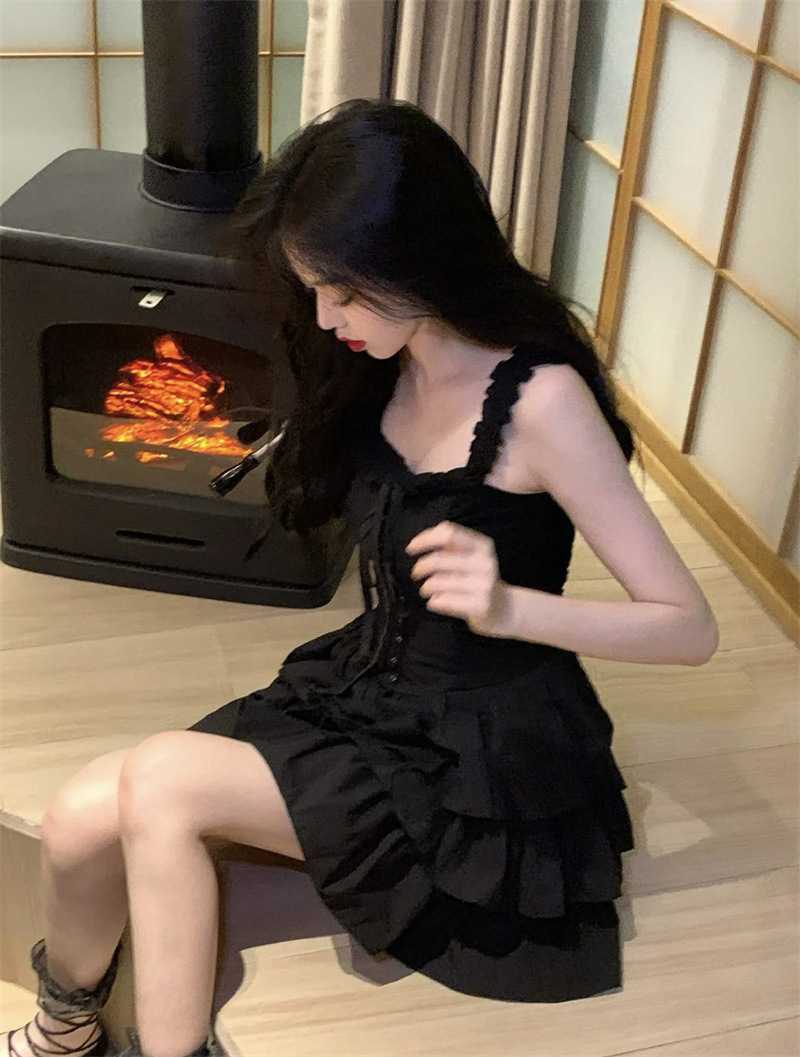 法式吊带连衣裙女夏季纯欲性感荷叶边气质高级感蛋糕短裙子小黑裙