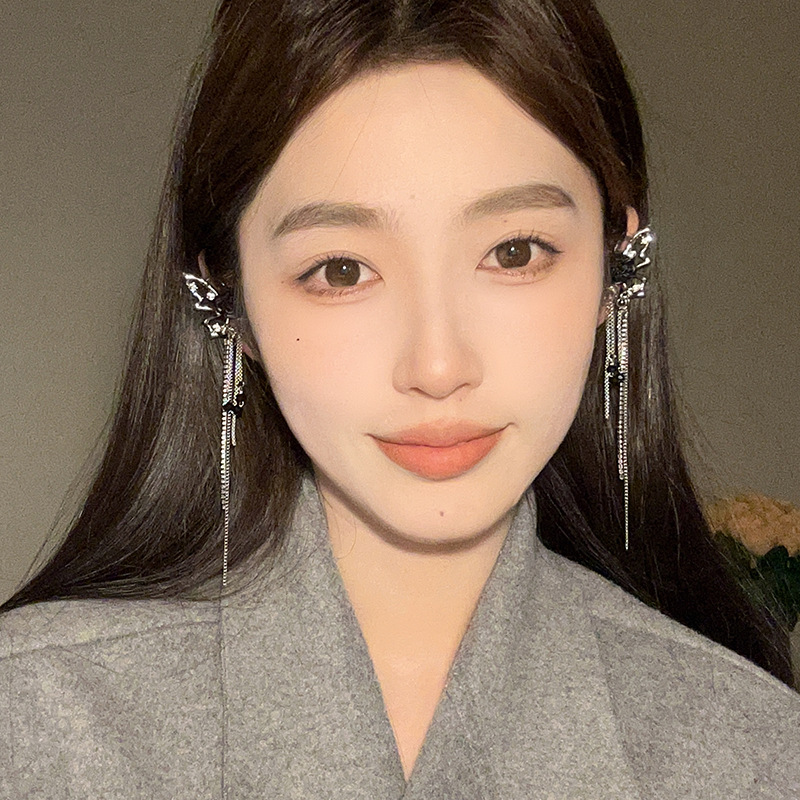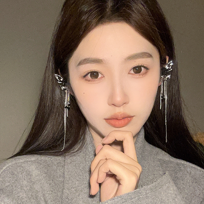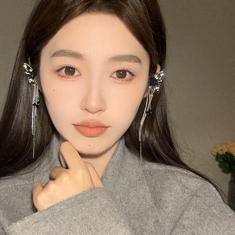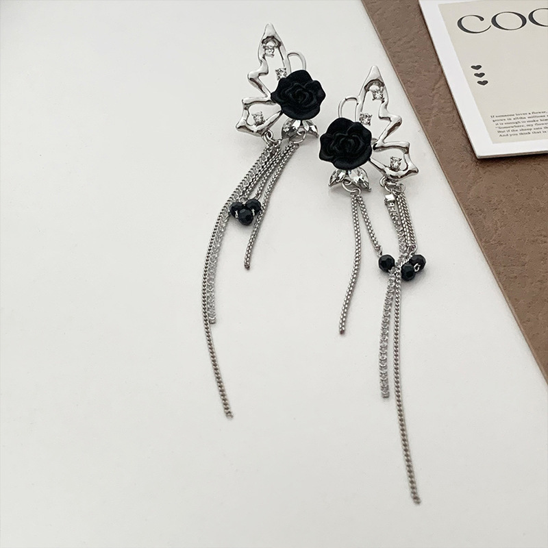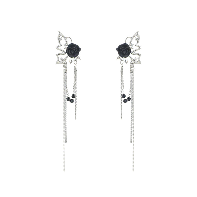 圣诞节暗夜精灵黑色玫瑰蝴蝶耳夹无耳洞长款流苏耳夹甜酷小众耳饰
