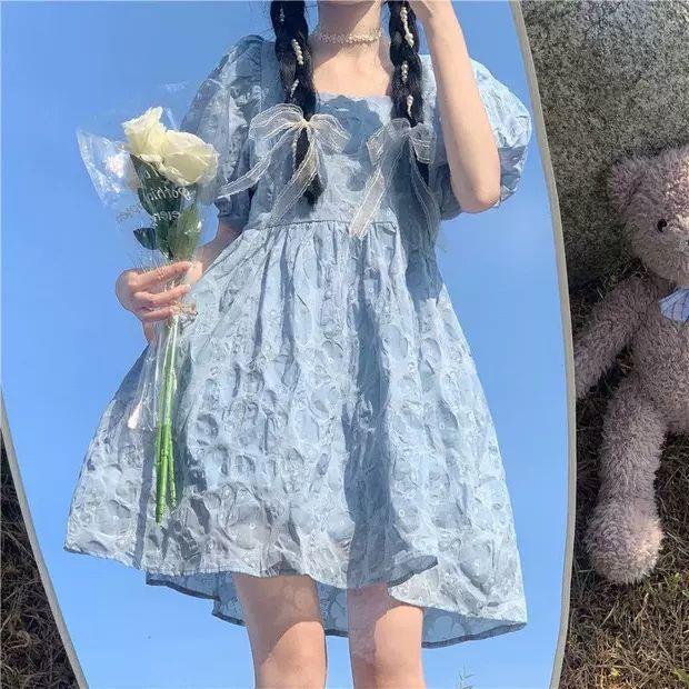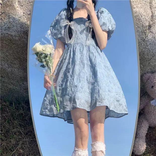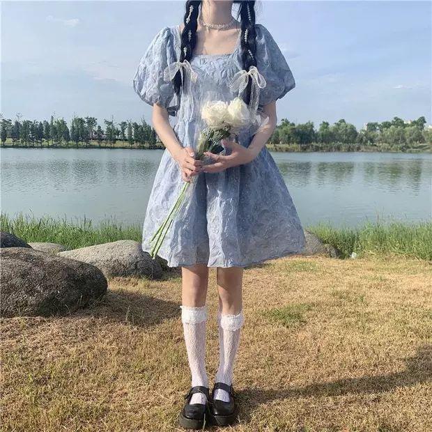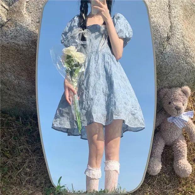 初恋白月光连衣裙夏新款仙女裙方领提花蓬蓬裙小个子连衣裙女