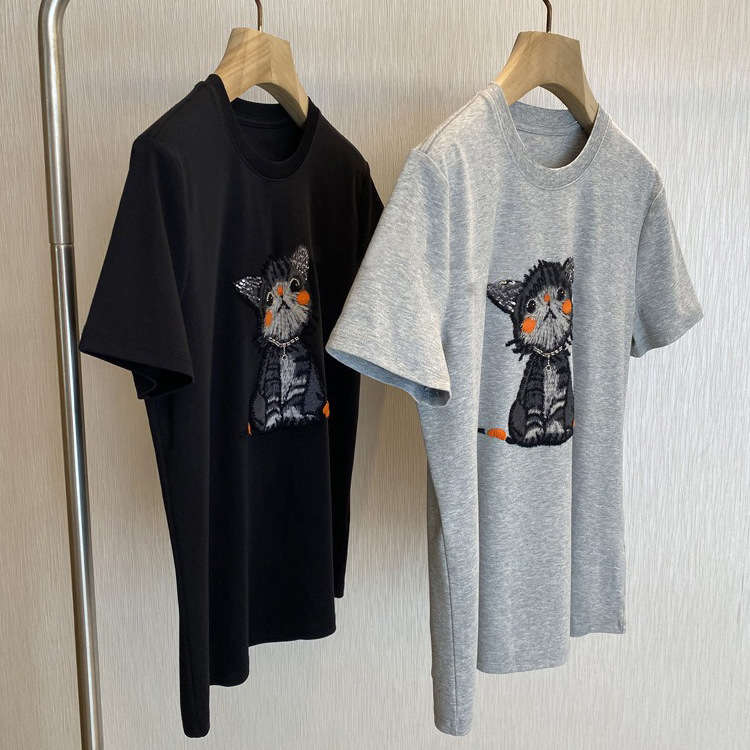 重工小猫刺绣钉珠正肩短袖t恤女夏季2025新款独特漂亮初夏上衣棉