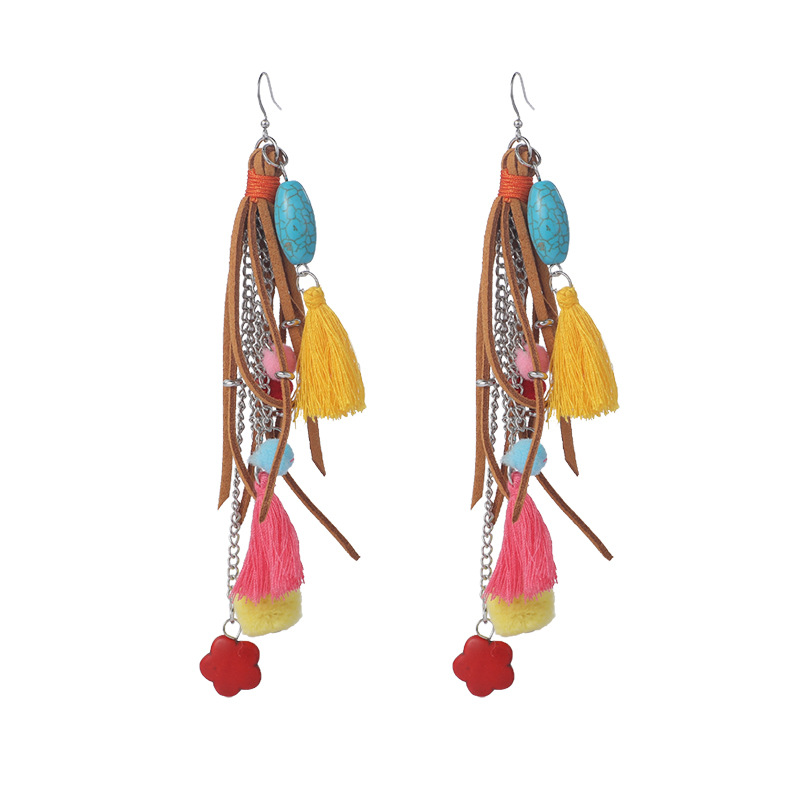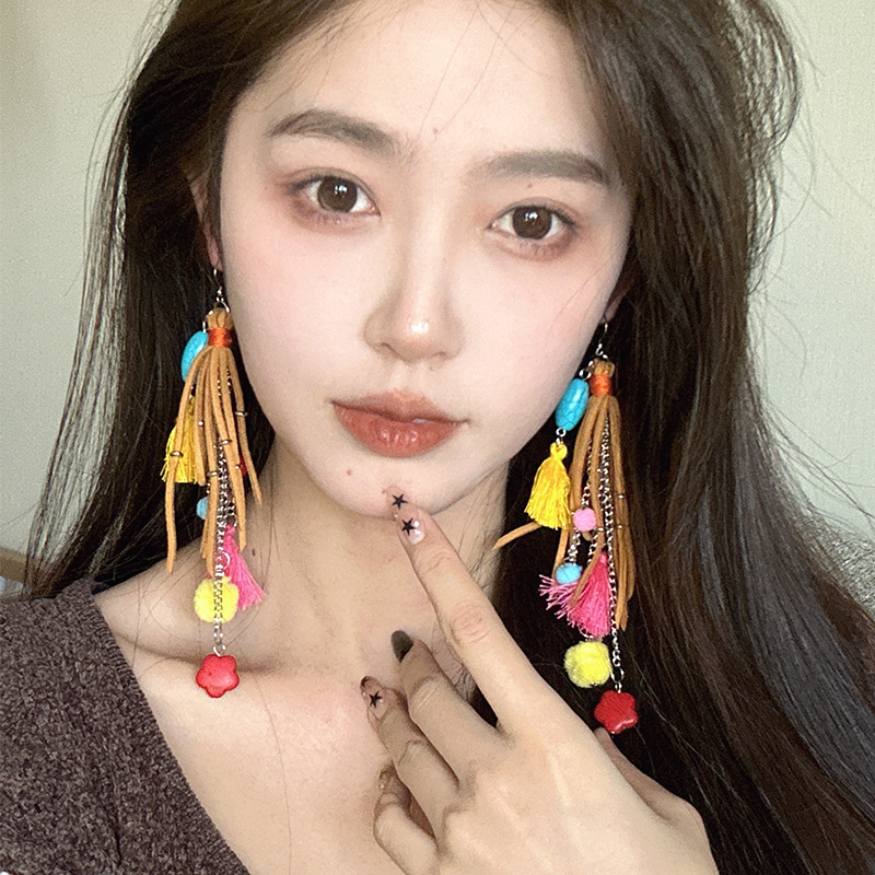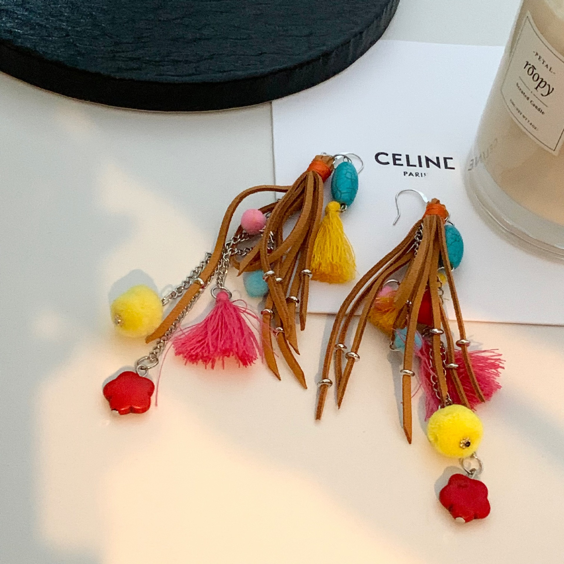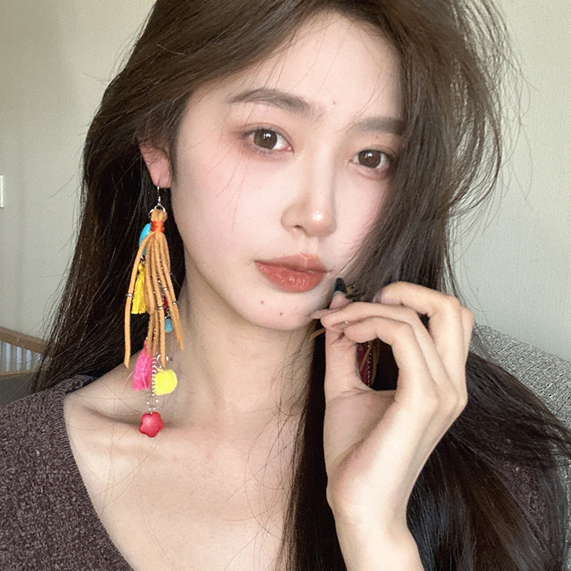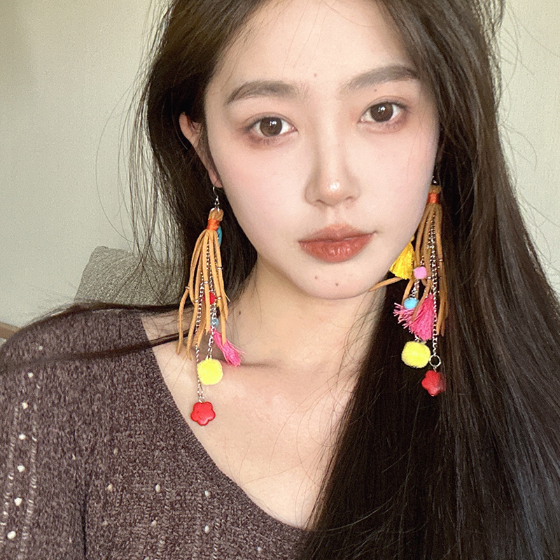 个性民族风彩色流苏皮绳耳环波西米亚毛球耳坠复古度假出游耳饰女