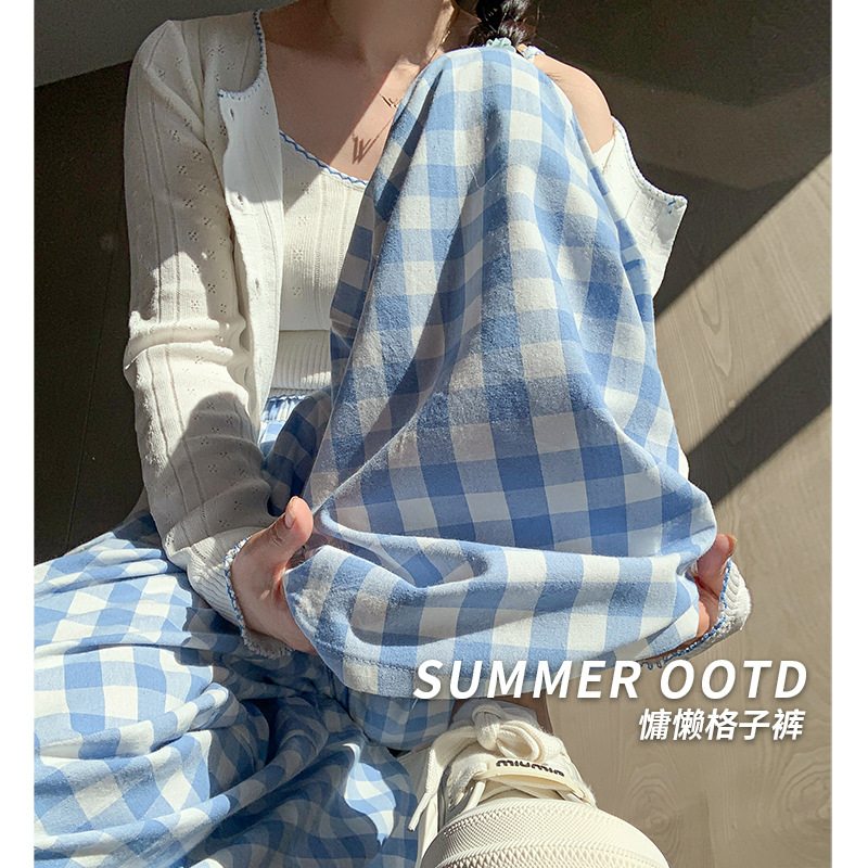 纯棉格子阔腿裤女夏季女装新款高腰垂感休闲裤遛弯山本直筒裤
