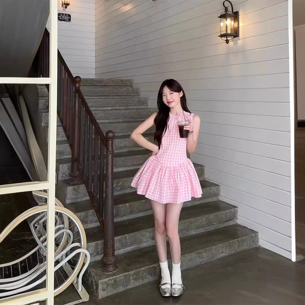 粉色格子背心连衣裙女夏季新款纯欲风收腰显瘦减龄A字蓬蓬短裙子
