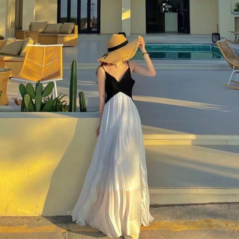 海边度假连衣裙沙滩裙女夏三亚旅游拍照衣服超仙黑白拼色百褶吊带
