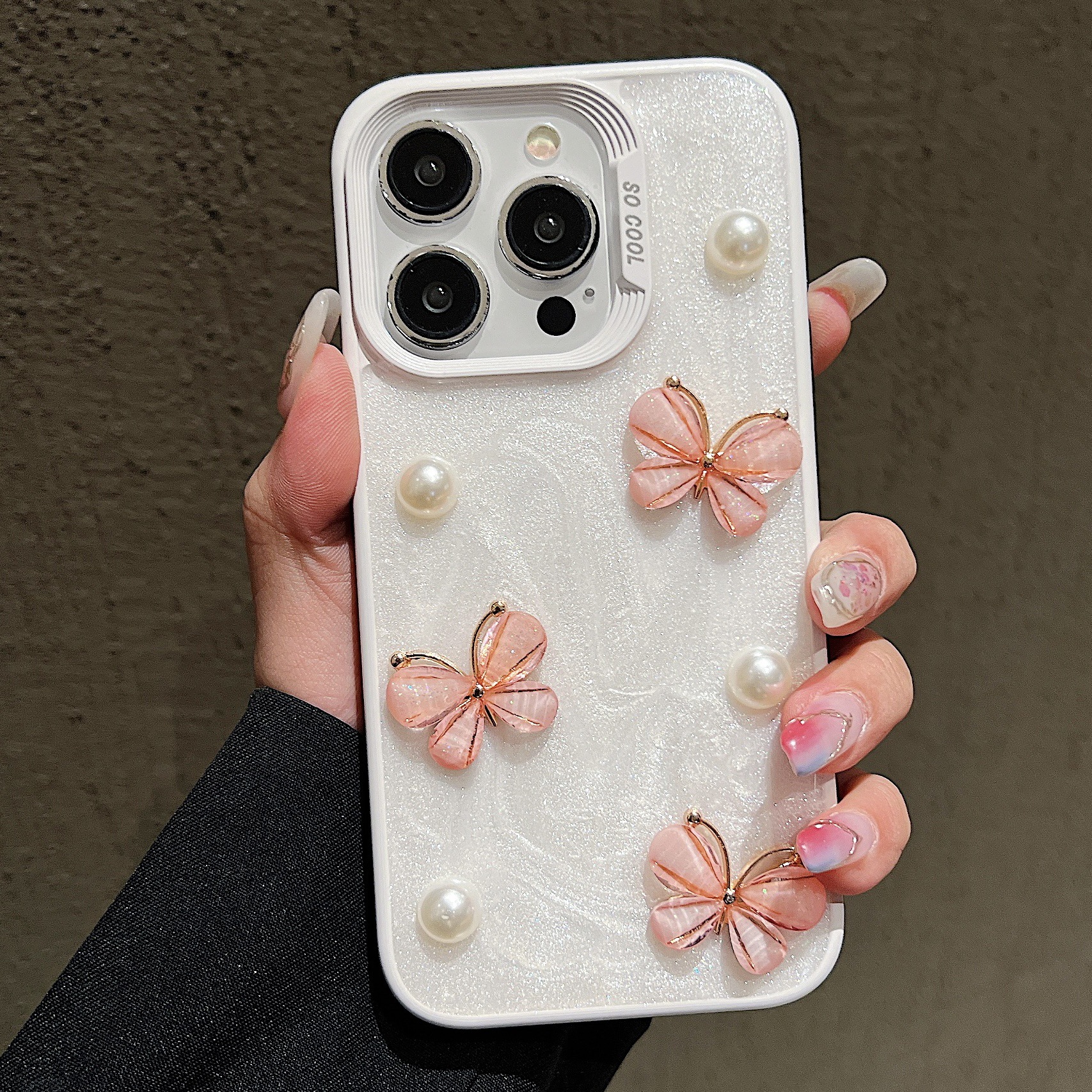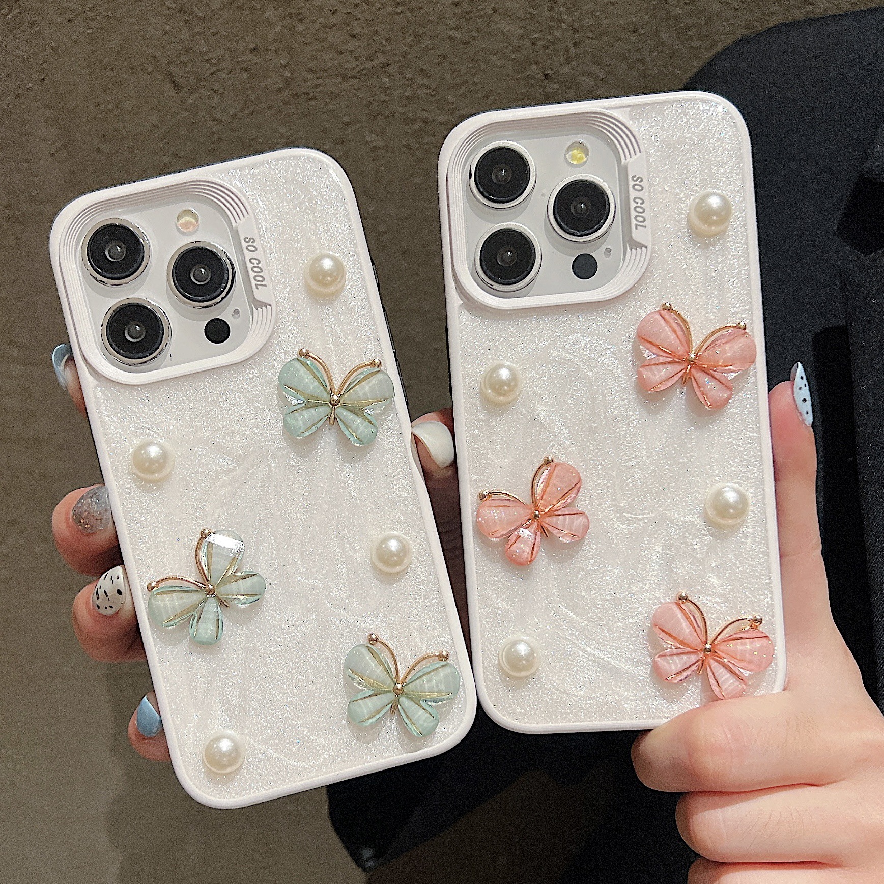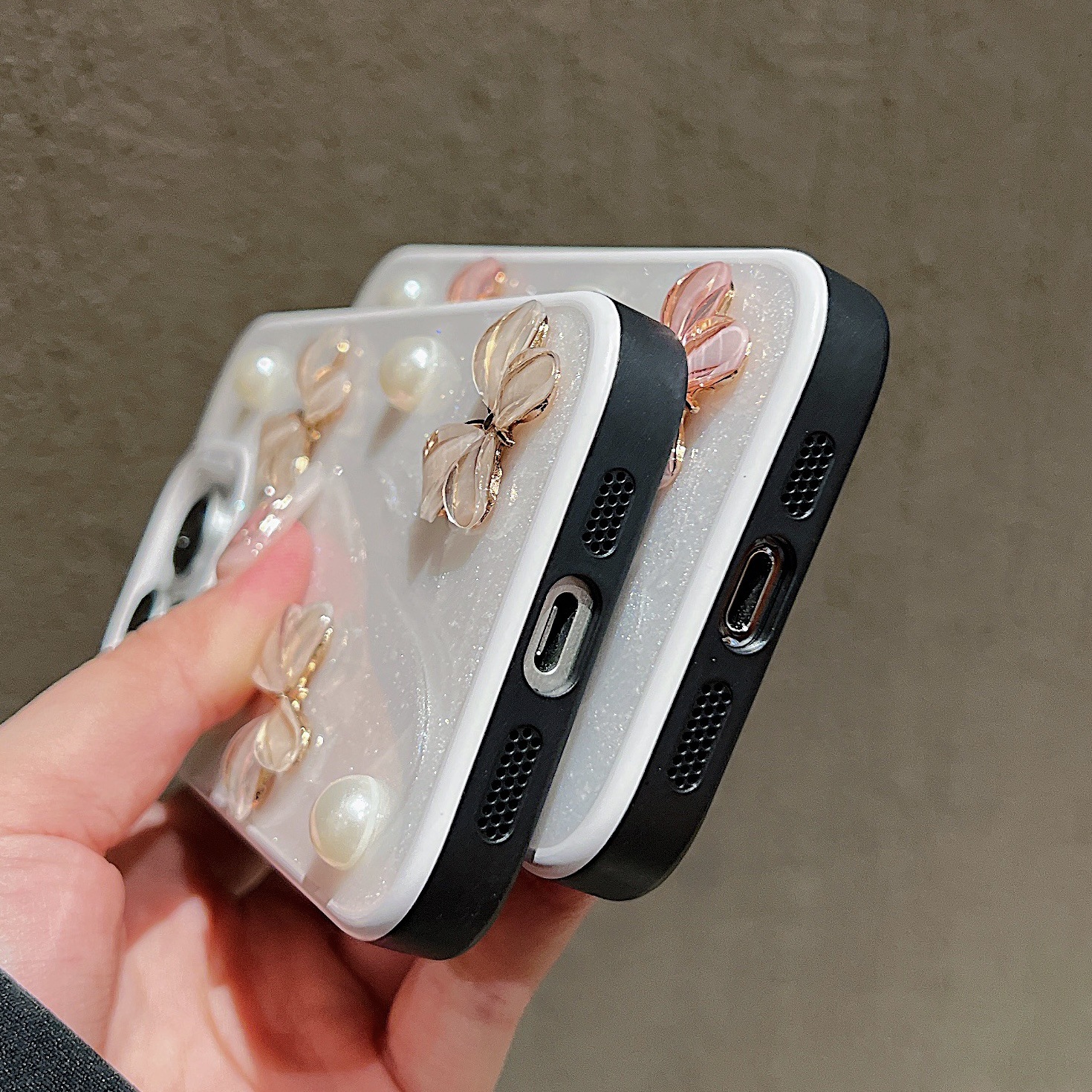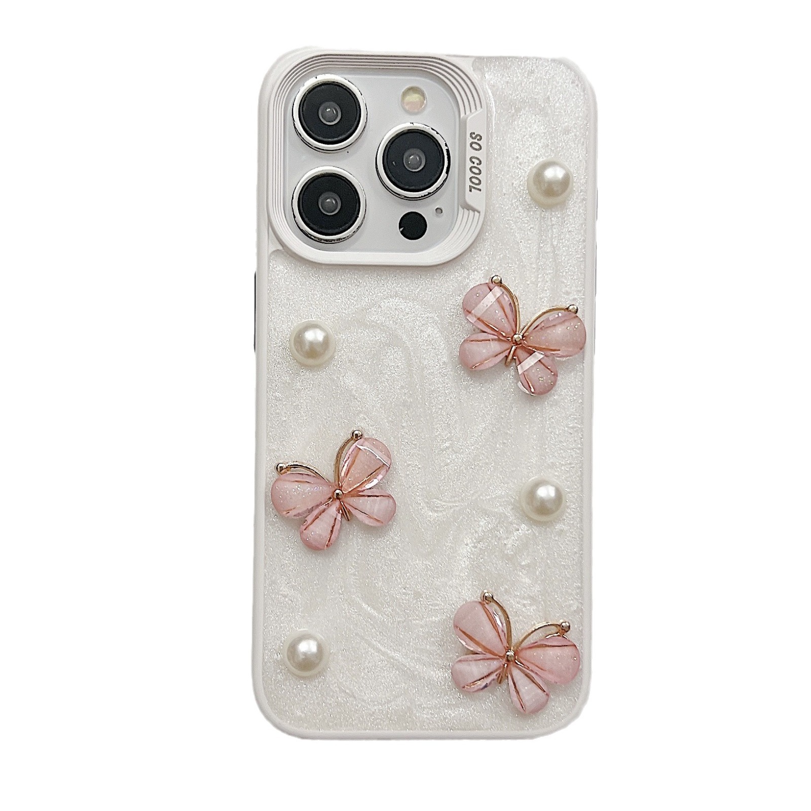 立体滴胶珍珠蝴蝶适用15Promax手机壳14pro苹果13防摔12/11水泥白